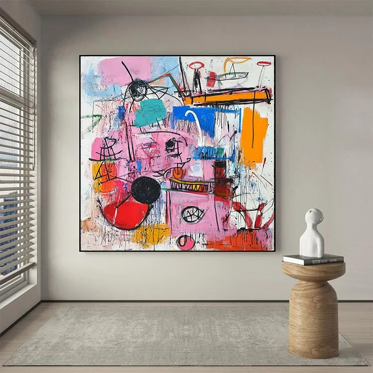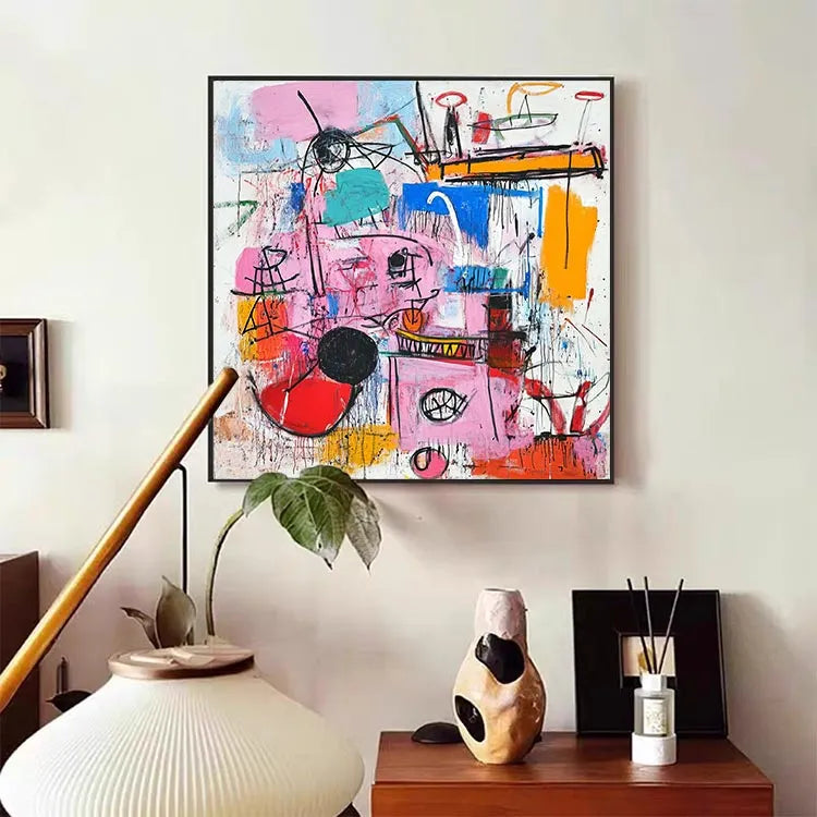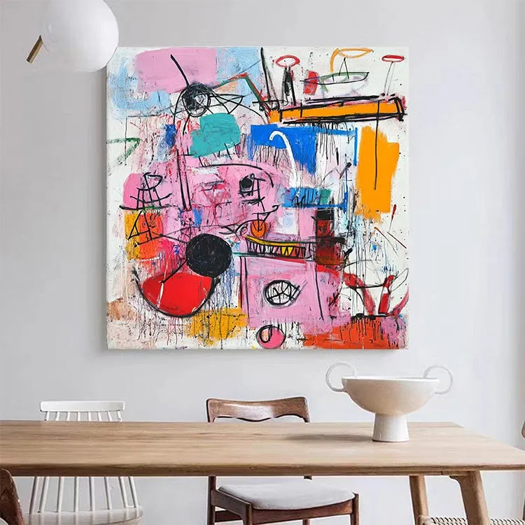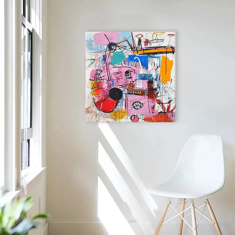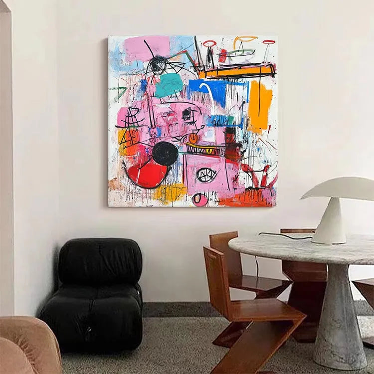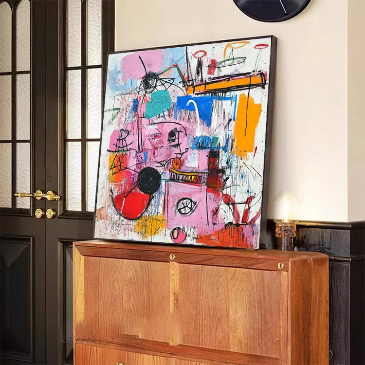 This abstract painting, characterized by its vibrant and chaotic composition, appears to belong to the Abstract Expressionist movement. The use of bold, contrasting colors such as pink, blue, and orange creates a dynamic and energetic visual experience. The brushstrokes are thick and deliberate, with visible texture adding a sense of spontaneity and movement. Geometric shapes and lines intersect and overlap, suggesting a complex, layered narrative. The interplay between color and line is crucial, with the black and red circles drawing the viewer's eye. The overall style is reminiscent of Jackson Pollock's works, with its raw, emotive quality and emphasis on process over form. The painting's chaotic yet harmonious balance of color and line evokes a sense of disorder and creativity.