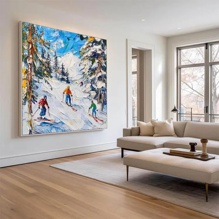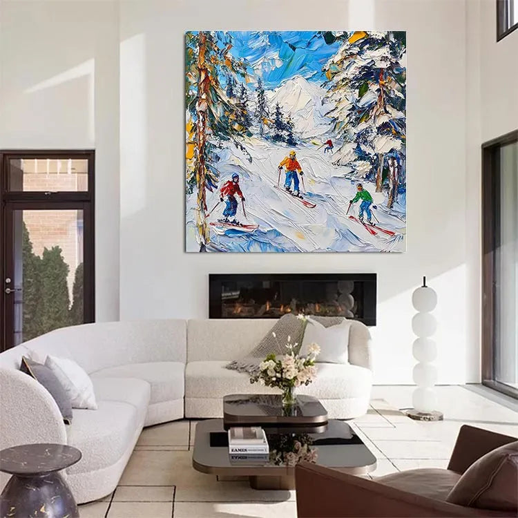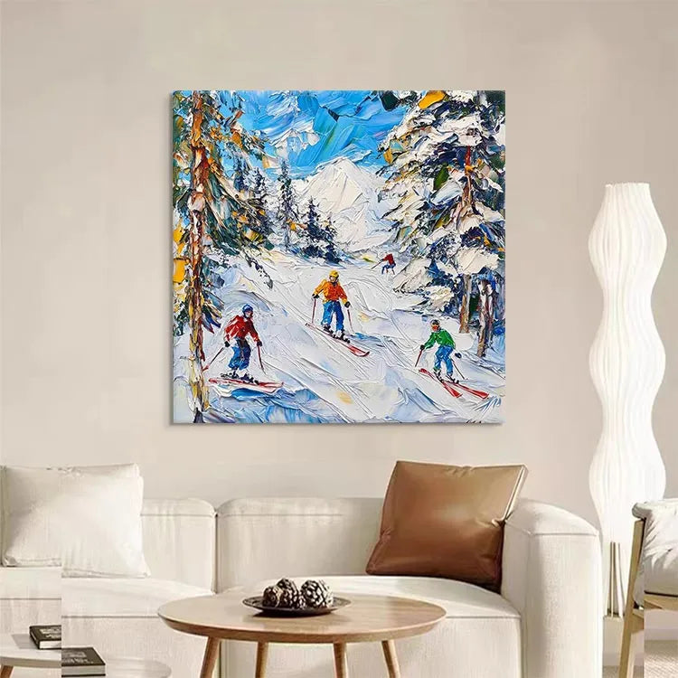 This vibrant painting captures a dynamic winter scene of four skiers descending a snowy mountain slope, characterized by its expressive, impressionistic style. The artist employs thick, visible brushstrokes that create a sense of movement and texture, particularly in the snow and trees. The use of color is vivid, with a striking contrast between the bright ski outfits (orange, red, yellow, and green) and the snowy white landscape. The sky is painted in swirling blues and whites, suggesting a windy, yet clear day. The composition leads the eye from the foreground to the distant, snow-capped mountain, using diagonal lines to convey motion. The painting's style and technique evoke the spirit of the Impressionist movement, focusing on light and movement rather than precise detail.