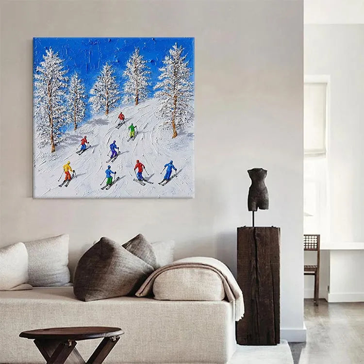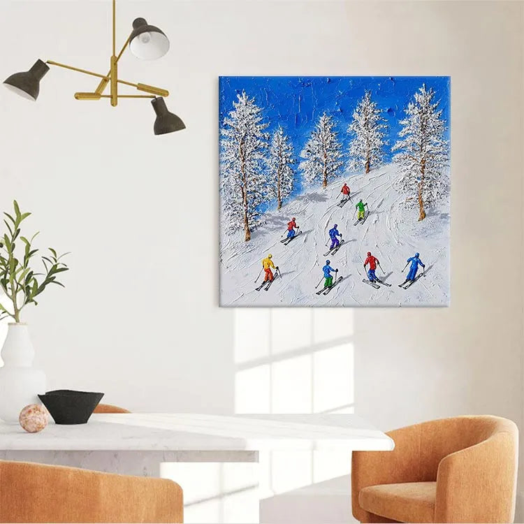 This oil painting captures a dynamic winter scene with a group of skiers descending a snowy slope. The composition features a balanced distribution of figures, with eight skiers in vibrant colors—yellow, red, green, and blue—creating a lively contrast against the white snow and deep blue sky. The texture is evident in the visible brushstrokes, adding a sense of movement and depth. The use of color is symbolic, with the bright ski suits suggesting individuality and joy, while the snow-covered trees provide a natural, serene backdrop. The light is subtly implied through the sky's gradient, enhancing the scene's realism. The style is reminiscent of Realism with a touch of Impressionism, focusing on everyday life with vivid, expressive detail.