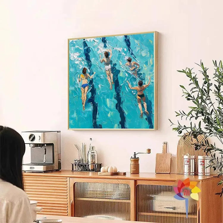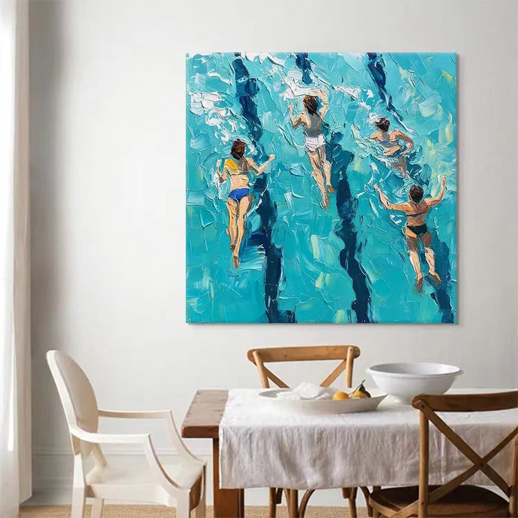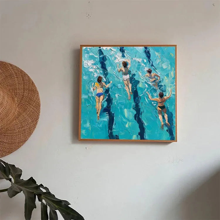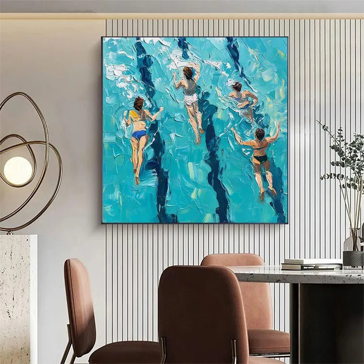 This painting, with its vibrant, textured brushstrokes, captures the dynamic movement of four children swimming in a pool. The artist employs a bold, impressionistic style, characterized by thick, expressive strokes that convey the fluidity of water and the motion of the children. The use of bright turquoise and blue hues dominates the composition, evoking a sense of summer and freedom. The light is subtly rendered, with dappled reflections on the water's surface. The children's varied swimwear—yellow, white, and black—adds visual interest and contrasts against the blue water. The painting's composition, with its diagonal alignment of the children, creates a sense of harmony and fluidity. This work may belong to the Impressionist movement, emphasizing spontaneous and vivid depictions of everyday life.