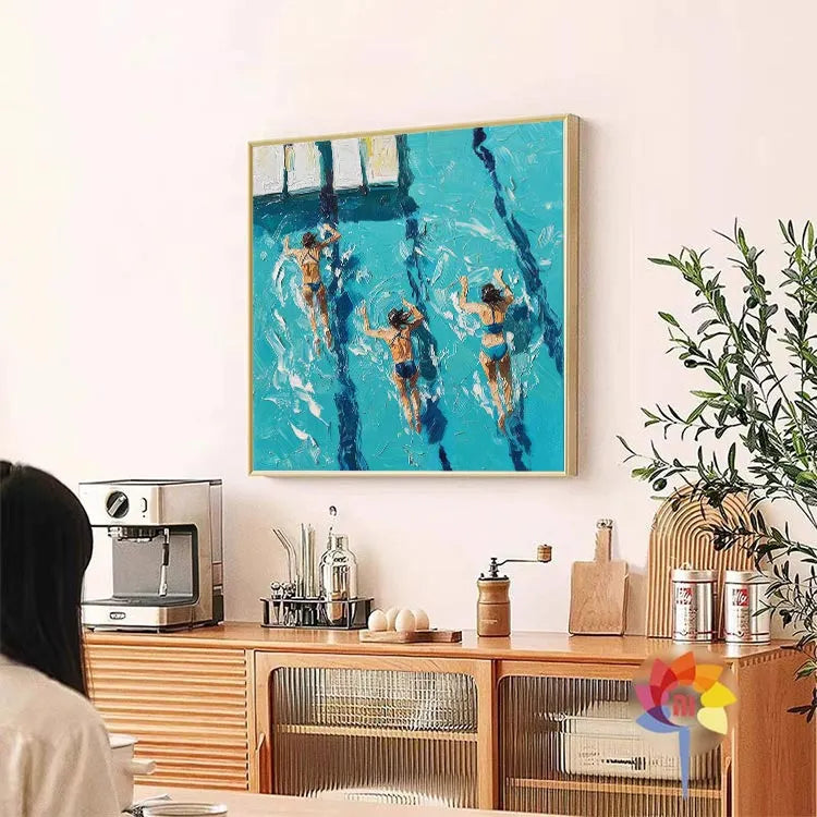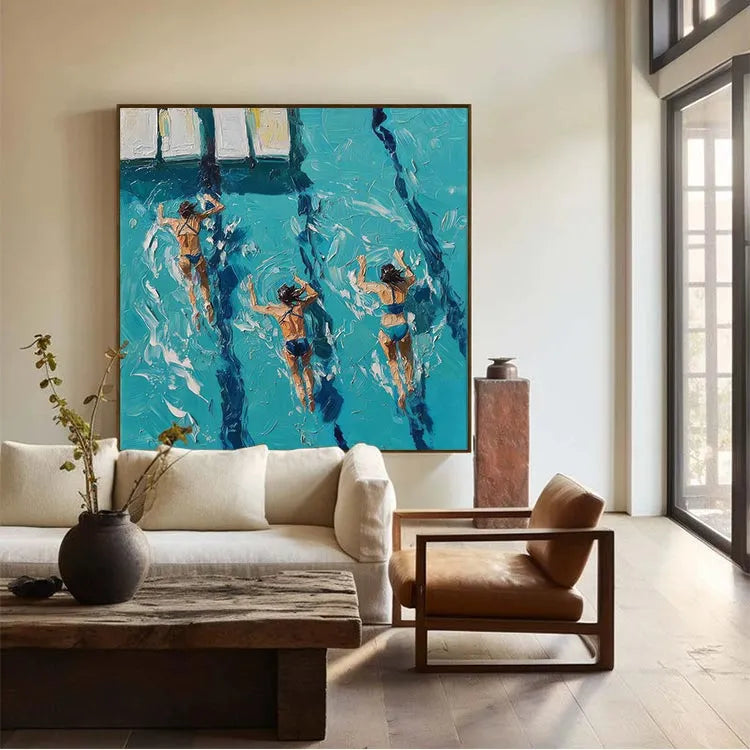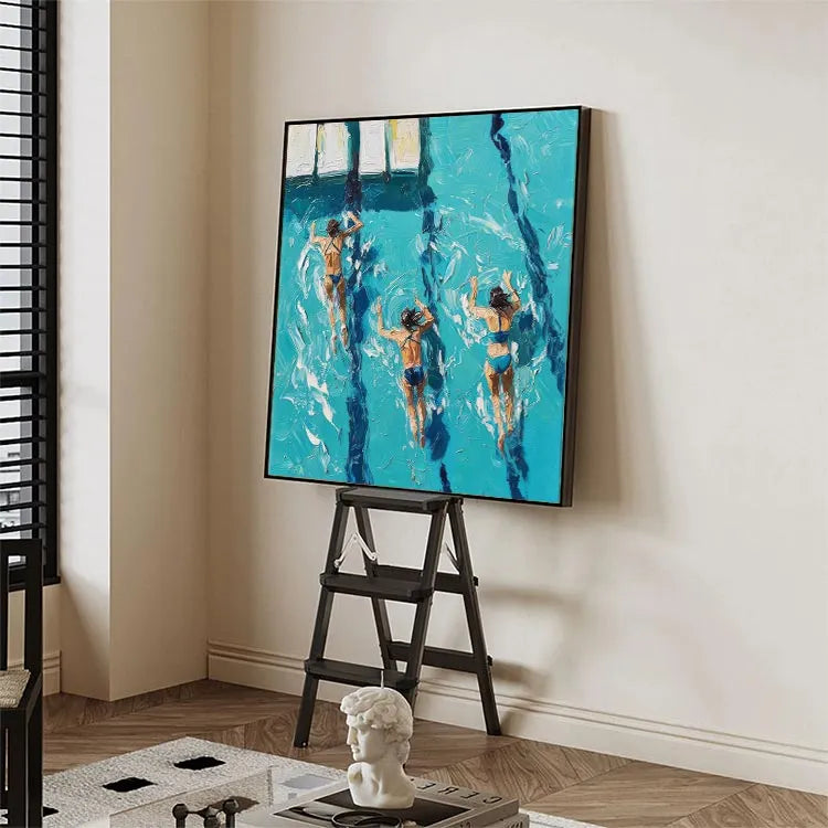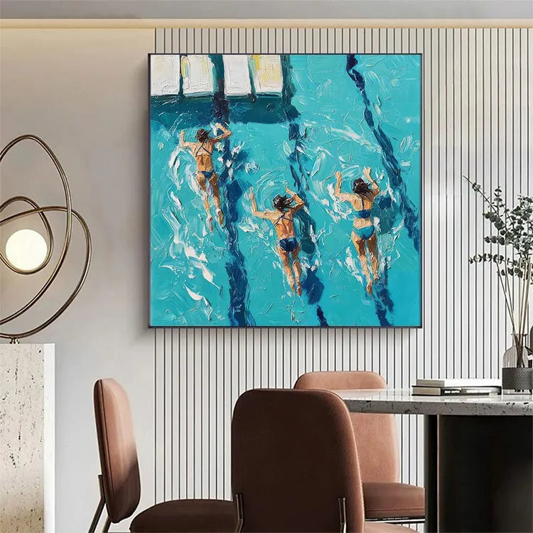 This painting, likely belonging to the contemporary realism movement, uses a vibrant, almost abstract style to depict three women swimming in a pool. The artist employs thick, expressive brushstrokes that create dynamic textures in the water and the women's skin. The use of color is striking, with vivid turquoise blues dominating the composition, contrasting with the white and dark blue shadows. The light is represented through the interplay of white and dark brushstrokes, suggesting sunlight reflecting off the water's surface. The composition's diagonal lines guide the viewer's eye through the scene, emphasizing movement and fluidity. The women's figures, though simplified, convey a sense of freedom and relaxation. The overall effect is both energetic and tranquil, capturing a moment of leisure with a modern, painterly approach.