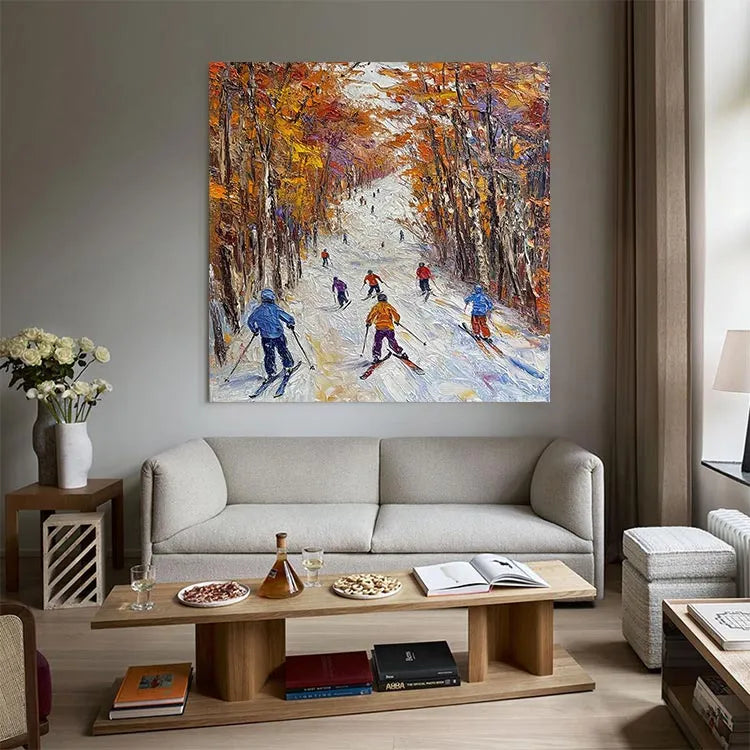 This painting, likely an impressionist or post-impressionist work, captures a dynamic winter scene of skiers descending a forested slope. The composition utilizes a strong vertical perspective, drawing the viewer's eye down the snowy path. The brushstrokes are vigorous and expressive, with a visible texture that conveys the movement of the skiers and the crispness of the snow. The color palette is vibrant, with warm autumnal hues of orange and yellow in the trees contrasting against the cool whites and blues of the snow and skiers' clothing. This contrast enhances the sense of depth and seasonal transition. The use of light is subtle, with the sky's pale light filtering through the trees, adding a sense of atmosphere. The style suggests influences of both Claude Monet and Henri Matisse, blending impressionist techniques with post-impressionist emotional intensity.