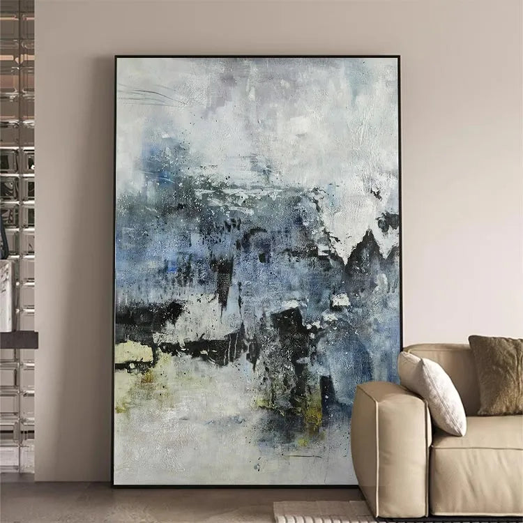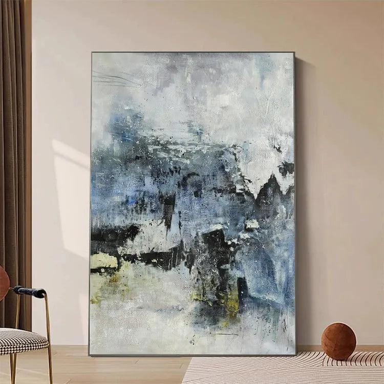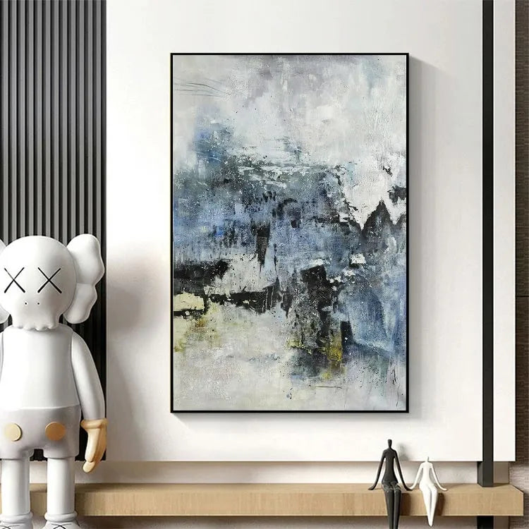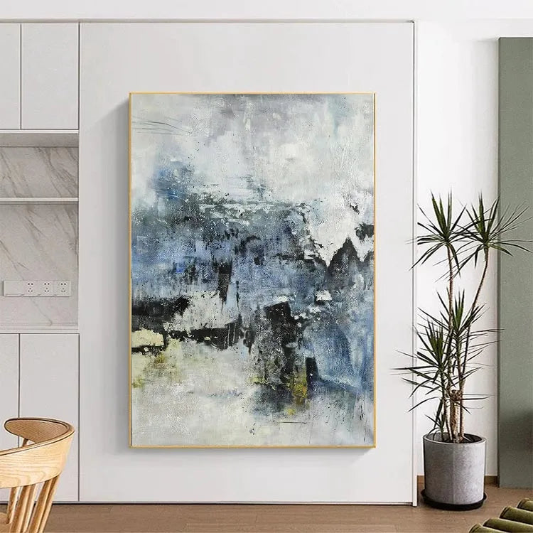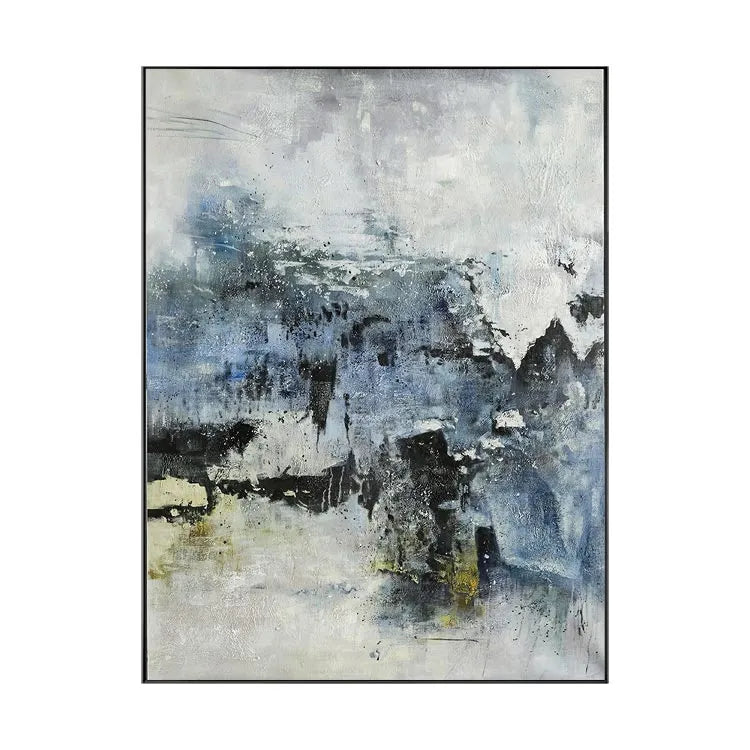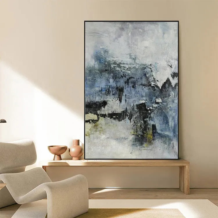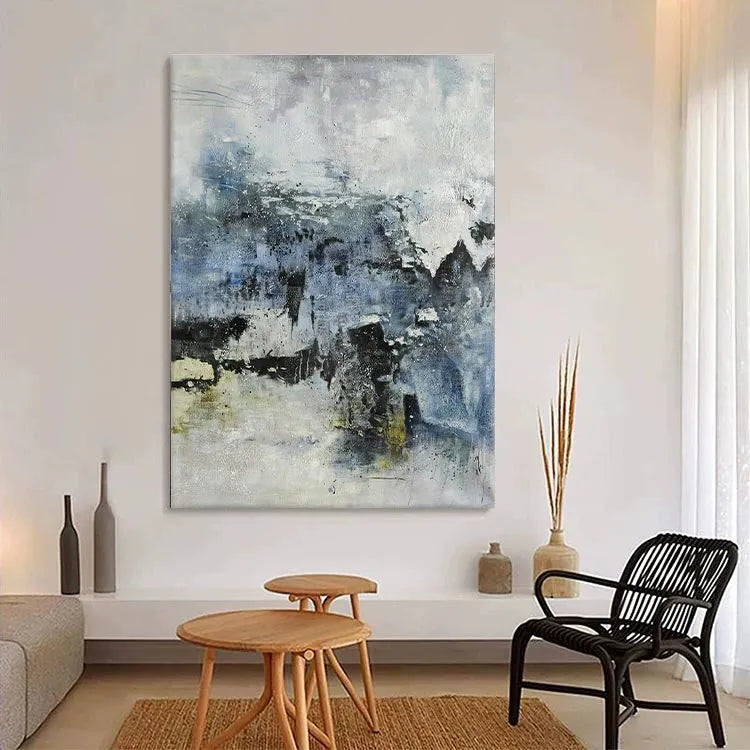 This abstract painting employs a textured, layered composition, with a predominantly cool color palette of blues, greys, and blacks, juxtaposed with subtle hints of yellow. The brushstrokes are rough and impasto, creating a sense of depth and movement. The use of color and texture suggests an emotional, perhaps contemplative, state. The horizontal and vertical lines intersect, guiding the viewer's eye across the canvas. The painting's style aligns with Abstract Expressionism, characterized by its spontaneous and emotional approach. The texture adds a tactile quality, enhancing the visual experience. The interplay of light and dark areas evokes a sense of mystery, while the overall composition maintains a balance between chaos and order.