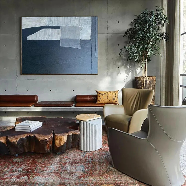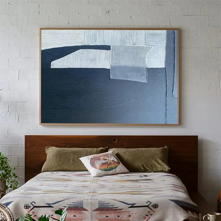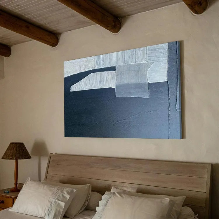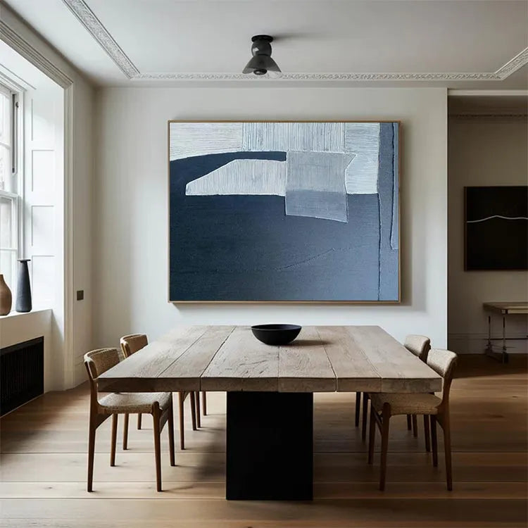 This oil painting exhibits a minimalist, abstract style, characterized by its geometric forms and restrained color palette. The composition features a series of overlapping rectangular and triangular shapes, rendered in varying shades of white, gray, and black. The textured brushstrokes create a subtle, almost tactile quality, enhancing the sense of depth and dimension. The use of light and shadow is masterful, with the white and gray sections casting soft, diffused shadows onto the dark background, evoking a sense of quiet, introspective mood. The painting's simplicity and precision suggest influences from the modernist movement, particularly the work of artists like Piet Mondrian. The overall effect is one of calm, contemplative elegance.