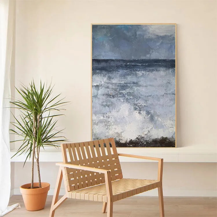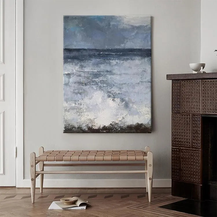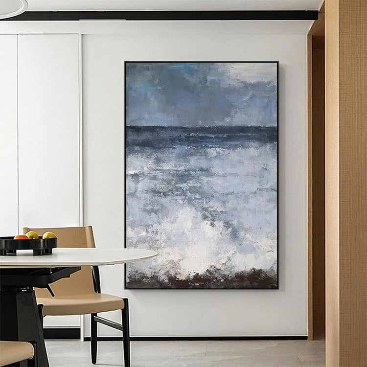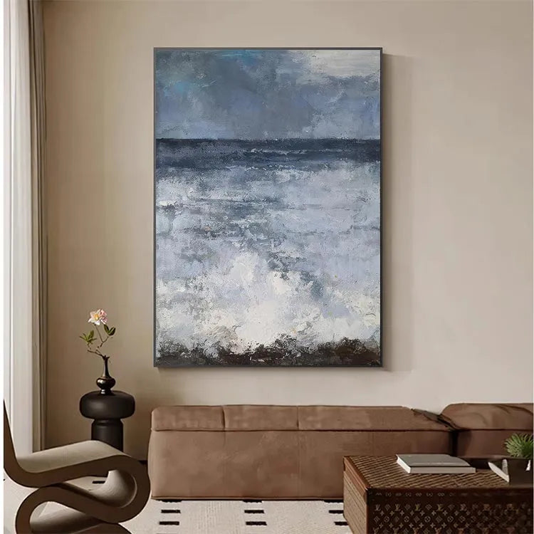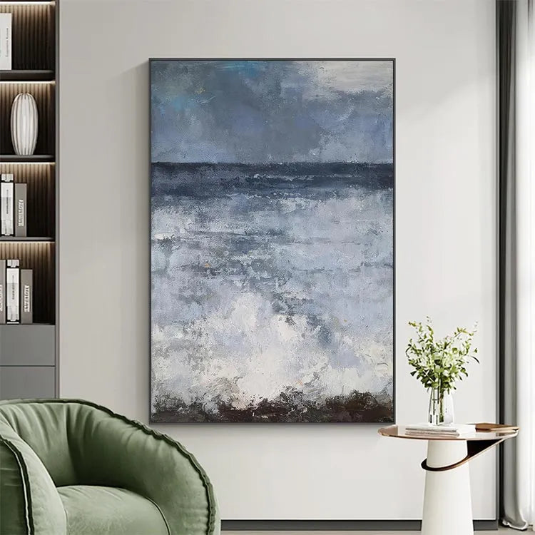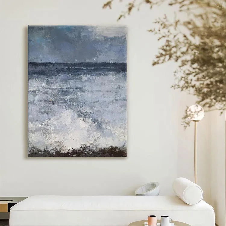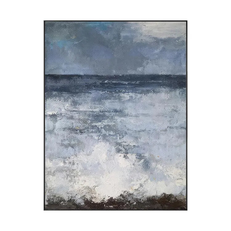 This oil painting captures a serene yet somber seascape, characterized by its textured, almost abstract brushwork. The composition employs a horizontal format, emphasizing the vastness of the ocean against the sky. The color palette is predominantly cool, with shades of blue, gray, and white, creating a melancholic mood. The artist uses thick, impasto textures in the foreground, contrasting with the smoother, more delicate application in the background. This juxtaposition draws the viewer's eye towards the horizon. The subtle gradations of light and shadow suggest a calm, overcast day. The painting's style is reminiscent of the Impressionist movement, with its emphasis on light and color over detailed representation. The overall effect is one of quiet contemplation and subtle emotional depth.
