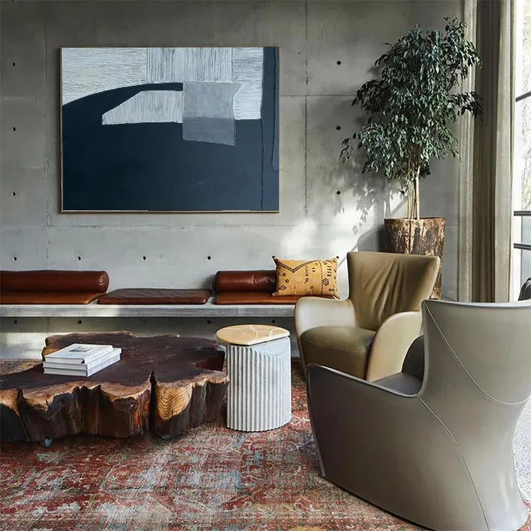 This oil painting showcases a minimalist approach with a focus on geometric forms and a limited color palette. The composition features stark contrasts between white, gray, and black, creating a sense of depth and shadow. The textured brushstrokes in the white and gray areas add a tactile quality, while the smooth black background provides a subtle yet effective contrast. The angular shapes and the interplay of light and dark suggest a modernist influence, possibly aligning with the principles of Bauhaus or De Stijl movements. The use of color is restrained yet effective, emphasizing simplicity and clarity. The overall effect is one of quiet elegance and contemplative stillness.