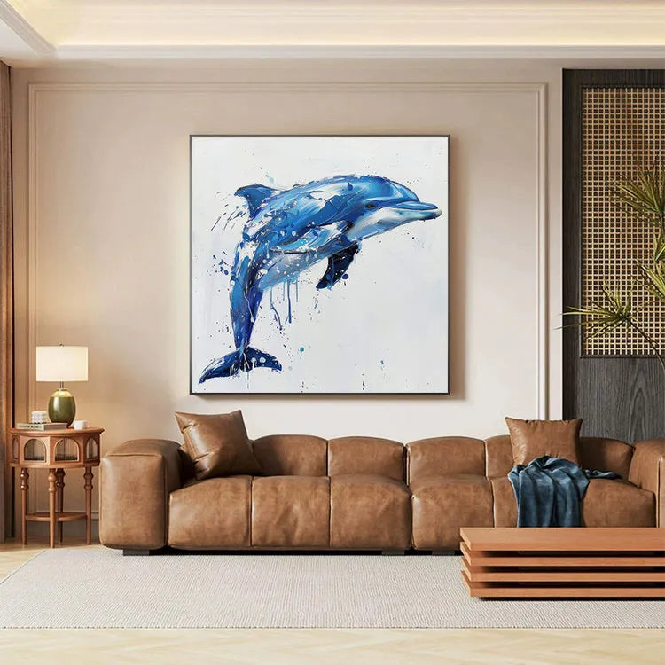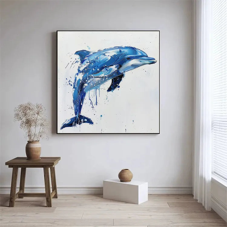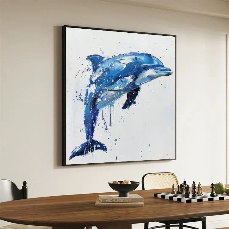 This oil painting of a dolphin features a dynamic, fluid composition with the subject captured in mid-leap. The artist employs a vibrant, blue color palette, with varying shades and highlights that create a sense of depth and movement. The use of brushstrokes is both bold and delicate, with visible splatters and drips adding a sense of spontaneity and energy. The texture is rich, with visible brushstrokes and a palpable sense of the dolphin's sleek, wet skin. The light source is subtle, yet effective, highlighting the dolphin's contours and creating a sense of realism within the abstract style. This work aligns with the Abstract Expressionism movement, emphasizing emotion and movement over strict realism. The splatters and drips may symbolize the dolphin's interaction with water, enhancing the painting's dynamic and lively nature.