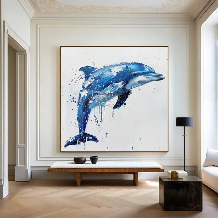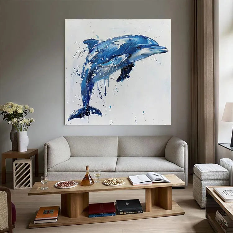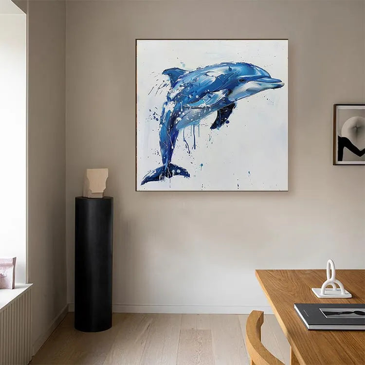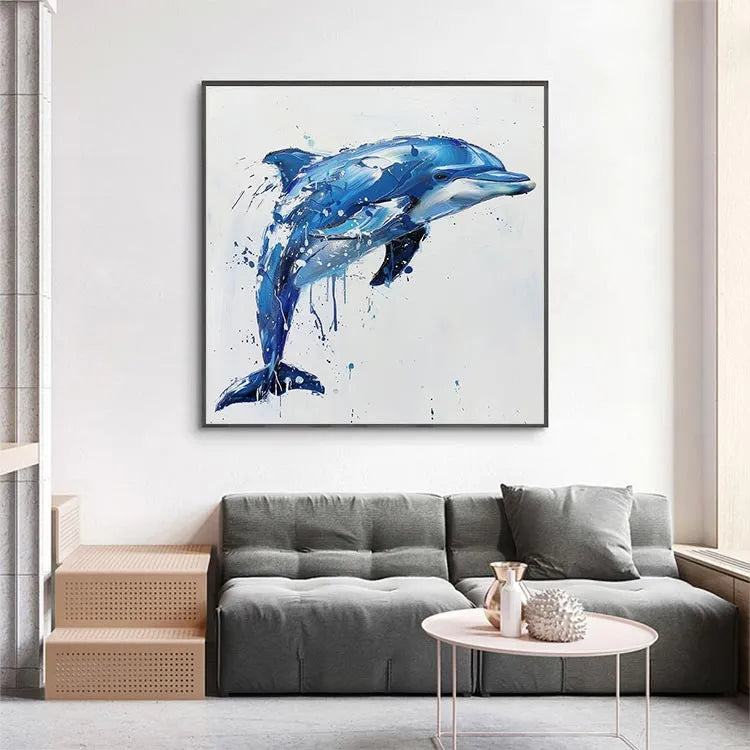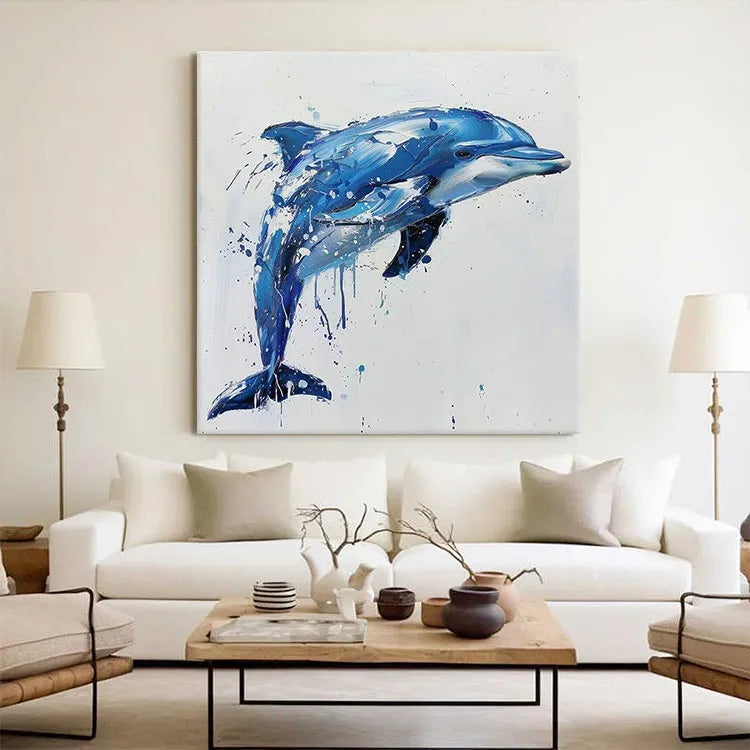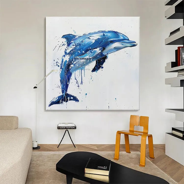 This painting, likely a contemporary abstract piece, features a dynamic depiction of dolphins leaping through water. The artist employs a vibrant, fluid use of blue and white, with splashes and drips of paint adding a sense of motion and spontaneity. The brushstrokes are loose and expressive, capturing the energetic movement of the dolphins. The texture of the paint is palpable, with visible brushstrokes and drips that add depth and vitality. The composition is balanced, with the dolphins centered and the splashes extending outward, suggesting the energy of their leap. This work aligns with the Abstract Expressionism movement, emphasizing emotion and movement over realism. The interplay of color and texture evokes a sense of freedom and joy.