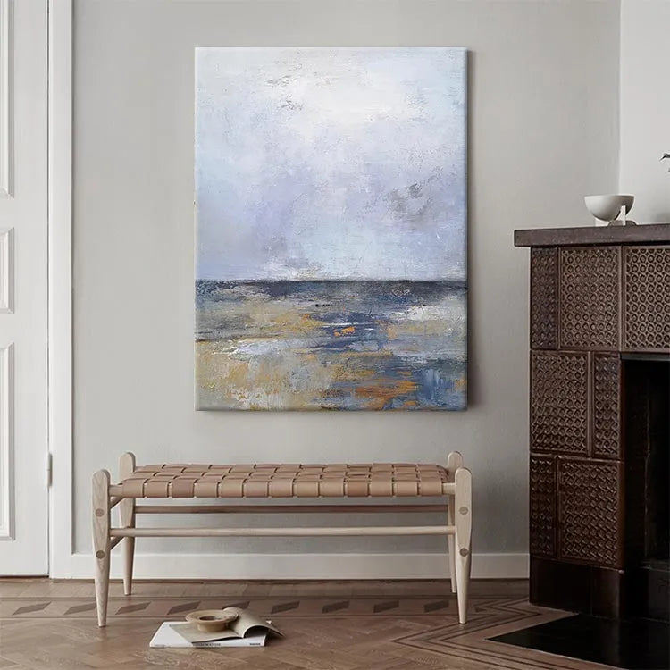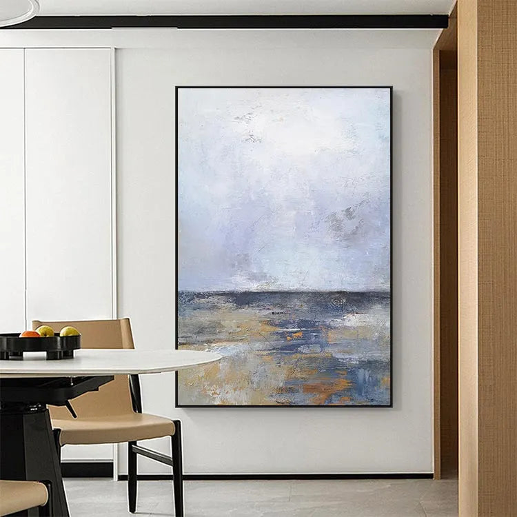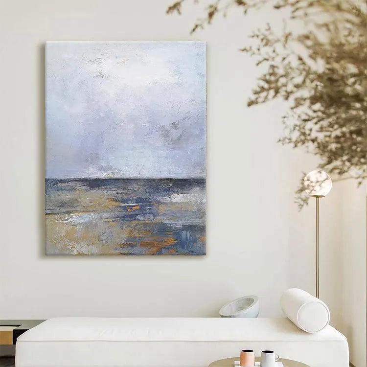 This oil painting exhibits a minimalist, almost abstract style, with a focus on the interplay between sky and water. The composition is simple, featuring a horizontal line where the sky meets the sea, with a subtle gradient from light to dark. The color palette is muted, dominated by shades of blue, gray, and yellow, which create a tranquil, contemplative mood. The texture is evident in the visible brushstrokes, adding a tactile quality to the smooth, yet slightly roughened, surface. The use of light is subtle, with a soft gradient suggesting a calm, overcast day. The painting's style aligns with modern abstract movements, emphasizing mood and atmosphere over detailed representation.