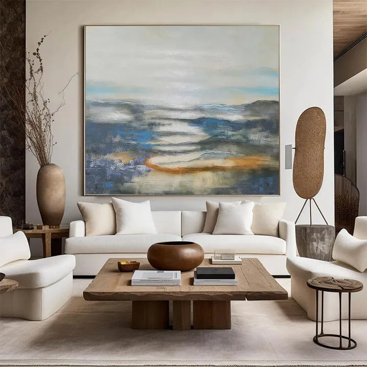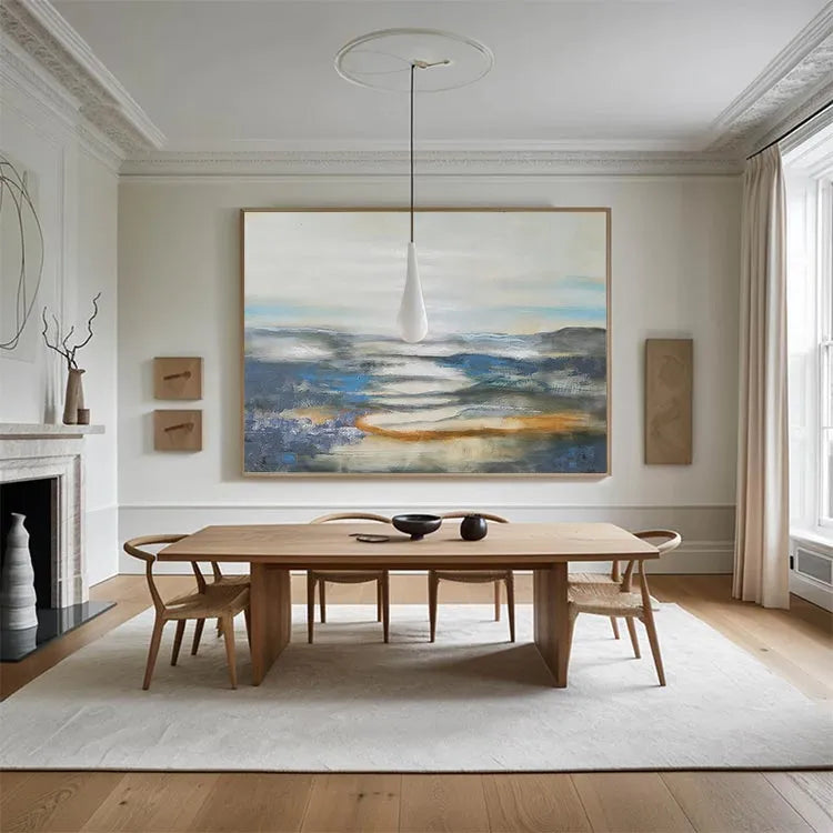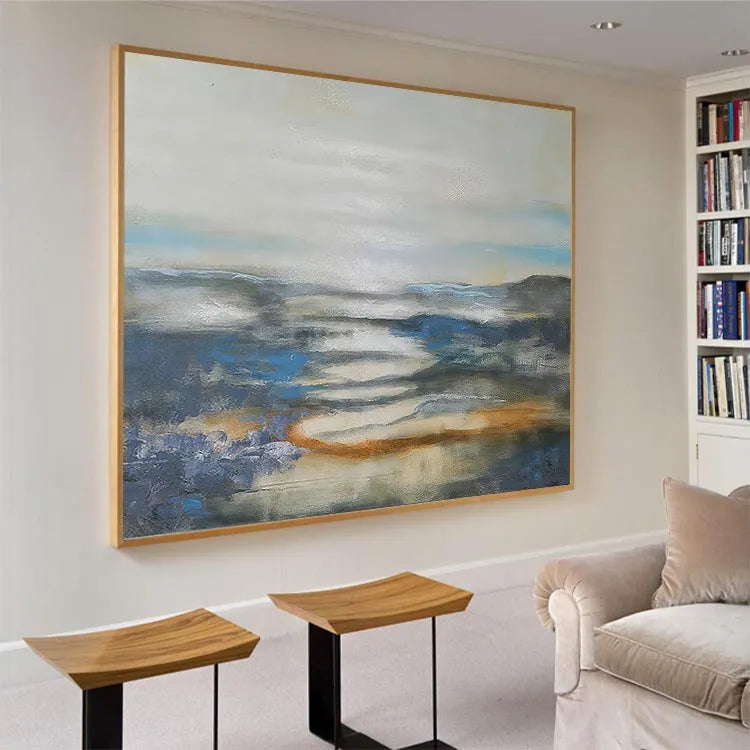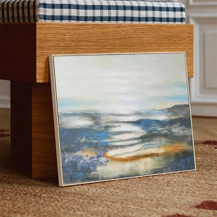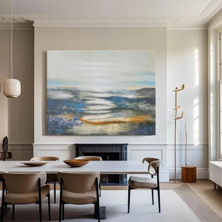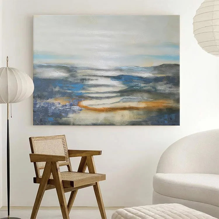 This oil painting exhibits a serene, ethereal landscape, characterized by its use of soft, diffused light and a restrained color palette. The composition features a misty, reflective body of water, with subtle, undulating forms of mountains in the background. The artist employs a loose, impressionistic style, with visible brushstrokes that add texture and movement to the scene. The use of color is minimal yet effective, with cool blues and grays contrasted by warm, orange-brown hues, suggesting a dawn or dusk light. The light source is subtle, creating a gentle, almost dreamlike atmosphere. The painting's texture is smooth yet varied, with visible glazes and layers that enhance the depth and tranquility of the landscape. This work may belong to the Impressionist movement, focusing on capturing the essence of a moment rather than precise detail.
