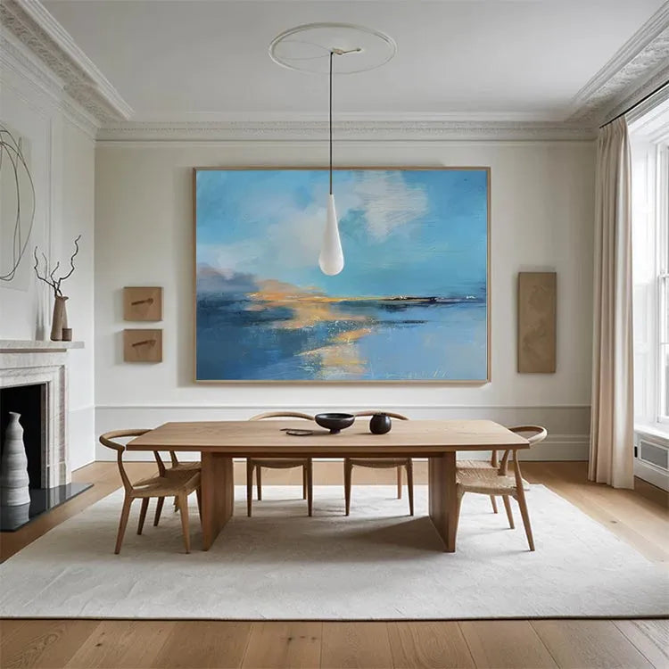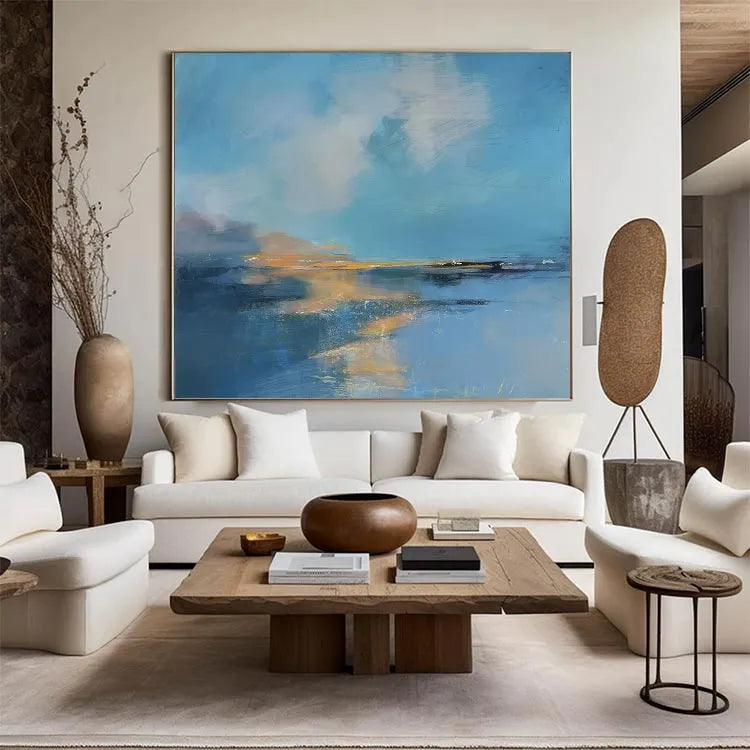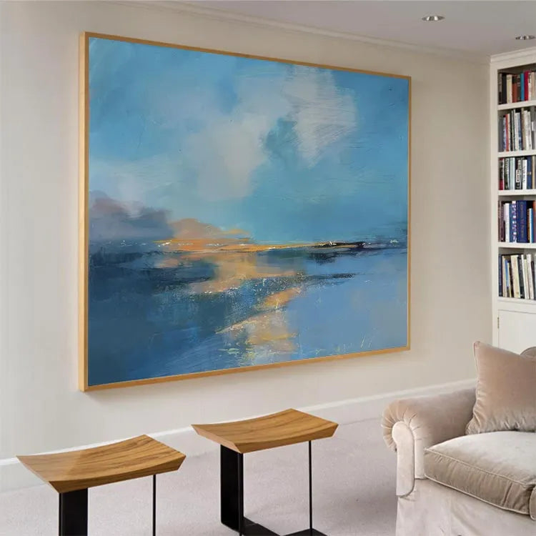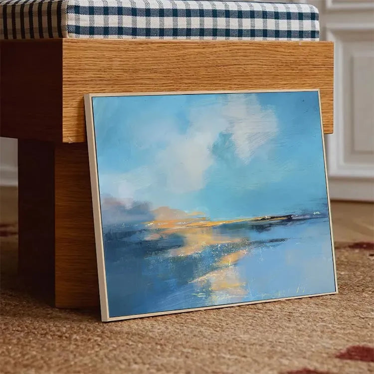 This oil painting exhibits a serene, abstract landscape with a focus on the interplay between light and water. The composition utilizes broad, sweeping brushstrokes that create a sense of movement and depth. The color palette is dominated by cool blues and warm yellows, which contrast harmoniously, symbolizing the transition between day and night or the reflection of sunlight on water. The sky is rendered with delicate, feathery textures, while the water below is more textured with visible brushstrokes, adding a sense of fluidity. The style suggests influence from the Impressionist movement, with its emphasis on light and color over detailed realism. The subtle gradations of blue and yellow evoke a tranquil, almost meditative atmosphere.