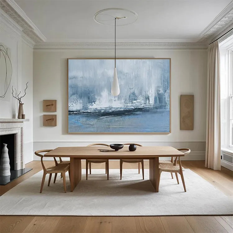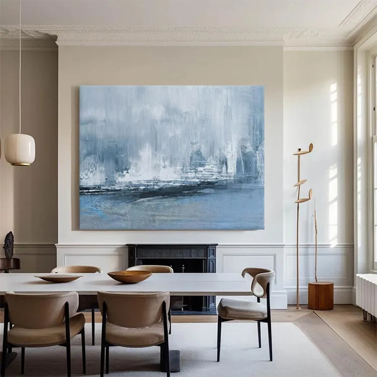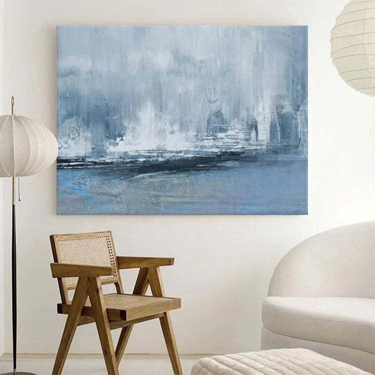 This oil painting employs a minimalist, abstract style, characterized by its restrained color palette and delicate, almost ethereal brushwork. The use of cool blues, whites, and grays creates a tranquil, almost melancholic atmosphere. The texture of the brushstrokes varies from smooth to rough, adding depth and complexity to the composition. The vertical lines and subtle gradations of light suggest a misty, atmospheric landscape, potentially inspired by the Impressionist movement. The subtle interplay between light and shadow, along with the diffused, almost transparent quality of the paint, evokes a sense of calm and introspection. The overall effect is both serene and contemplative, inviting the viewer to reflect on the beauty of subtle, understated forms.