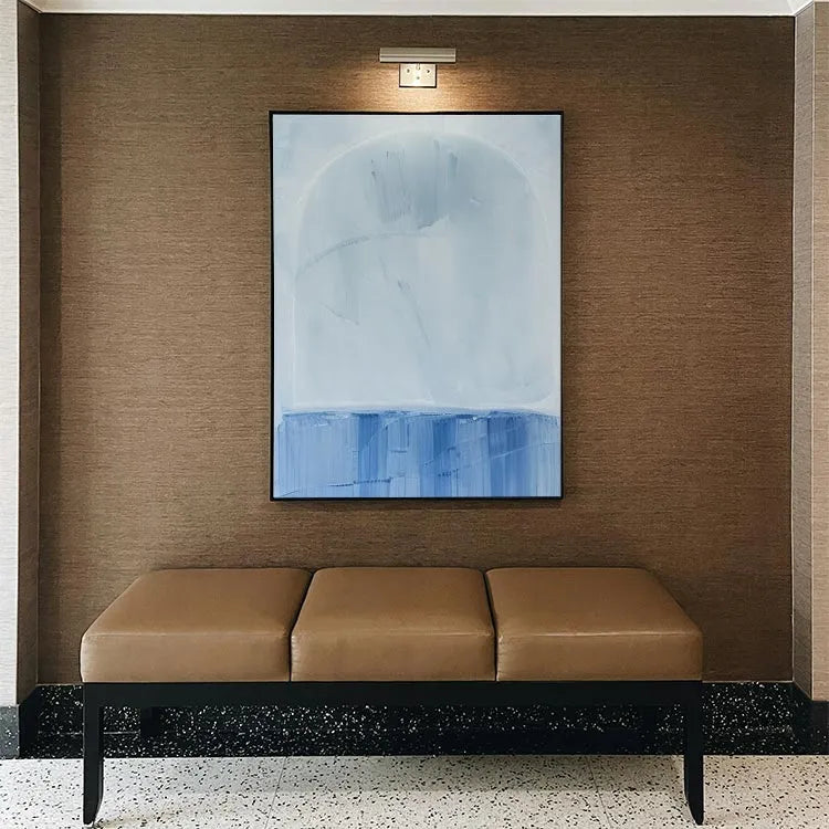 This painting, characterized by its minimalist and abstract composition, employs a restrained color palette of various shades of blue and white. The upper portion features a soft, translucent arch with delicate brushstrokes that suggest a subtle, almost ethereal light source. The lower section transitions into a more textured, layered blue, creating a sense of depth and movement. The artist's use of smooth and rough textures contrasts effectively, enhancing the visual interest. The painting's simplicity and focus on form and color place it within the modern abstract movement, reminiscent of the works of artists like Mark Rothko or Agnes Martin. The subtle interplay of light and texture conveys a serene, contemplative mood.