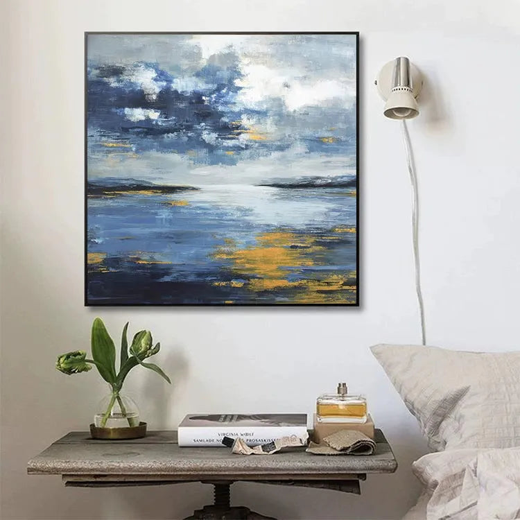 This painting, likely an example of modern or contemporary realism, employs a loose, impressionistic style characterized by bold, expressive brushstrokes. The use of color is particularly noteworthy, with a dynamic interplay between cool blues and warm yellows, creating a reflective, almost ethereal quality. The sky, filled with dense, cloud-like textures, suggests a moody, overcast atmosphere, while the water below mirrors these colors, adding a sense of calm and symmetry. The textured brushstrokes in the sky contrast with the smoother, more reflective surfaces of the water, enhancing the painting's depth. The composition leads the viewer's eye from the darker landmasses in the foreground to the lighter, more abstract sky, invoking a sense of journey or contemplation. The overall effect is one of quiet, introspective beauty, reminiscent of the works of the American Realist movement.