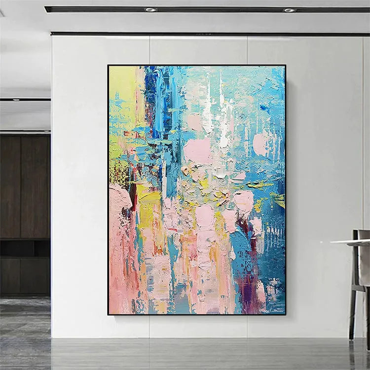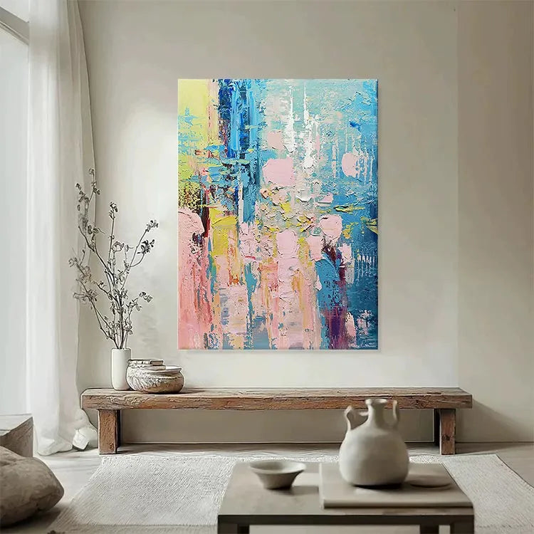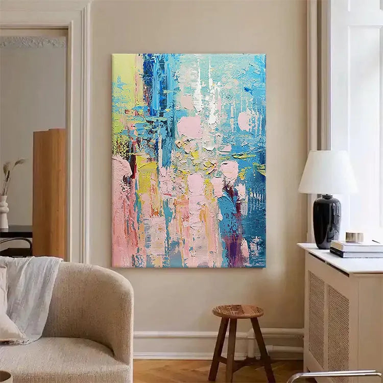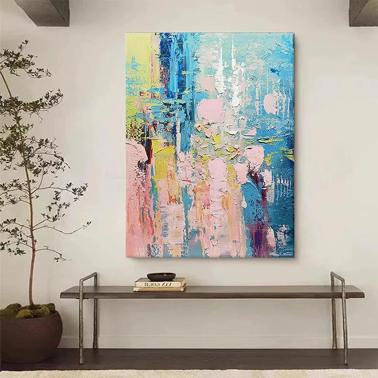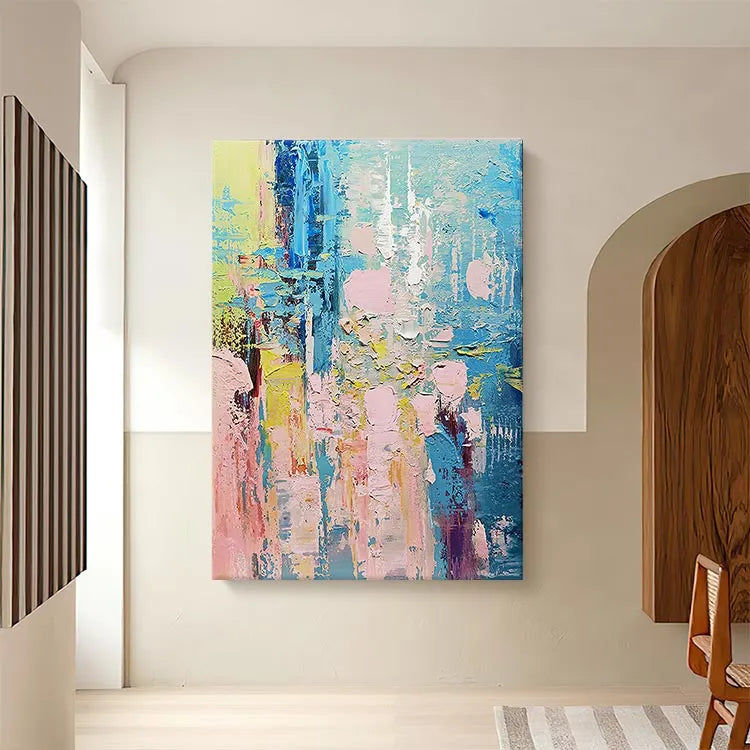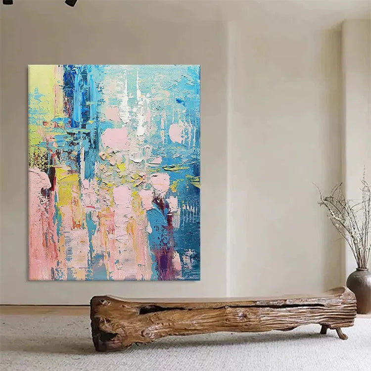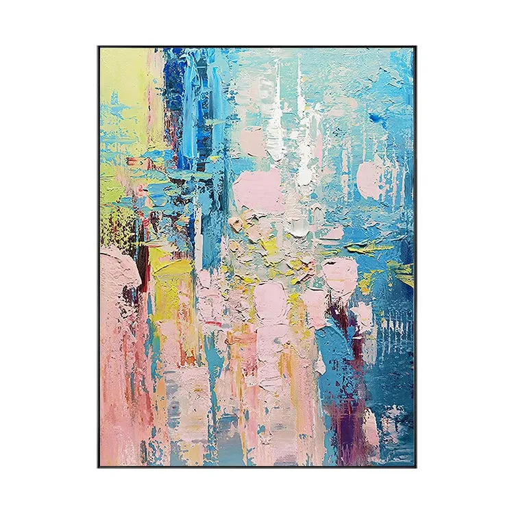 This abstract painting showcases a vibrant, textured composition characterized by thick, expressive brushstrokes and a dynamic interplay of color. The use of bright blues, pinks, yellows, and greens creates a sense of movement and energy, reminiscent of the Abstract Expressionist movement. The textured, almost three-dimensional quality of the paint suggests a tactile experience, inviting the viewer to touch. The varied brushstrokes range from smooth, flat areas to rough, impasto textures, adding depth and complexity. The composition lacks a clear focal point, instead encouraging a holistic appreciation of the color and texture interplay. The overall effect is both chaotic and harmonious, reflecting the spontaneity and emotional intensity of Abstract Expressionism.