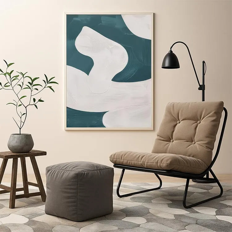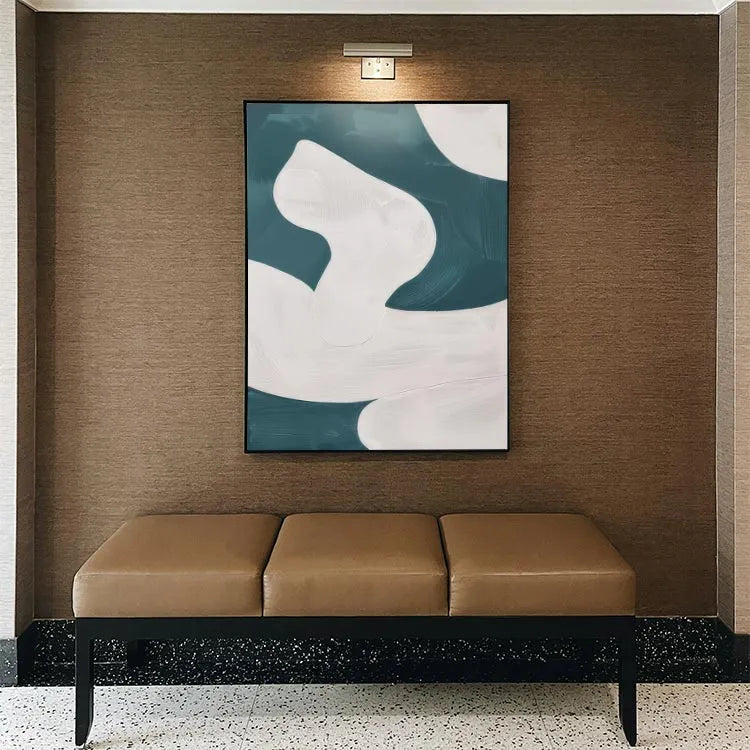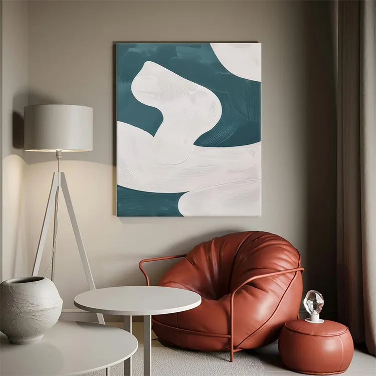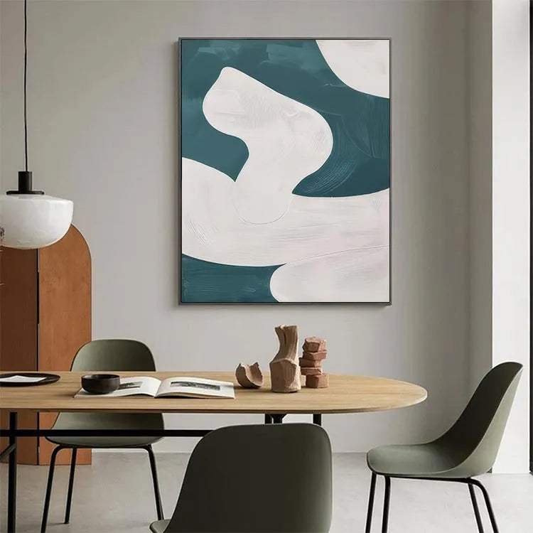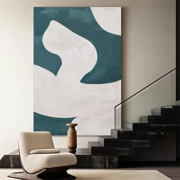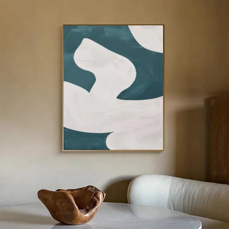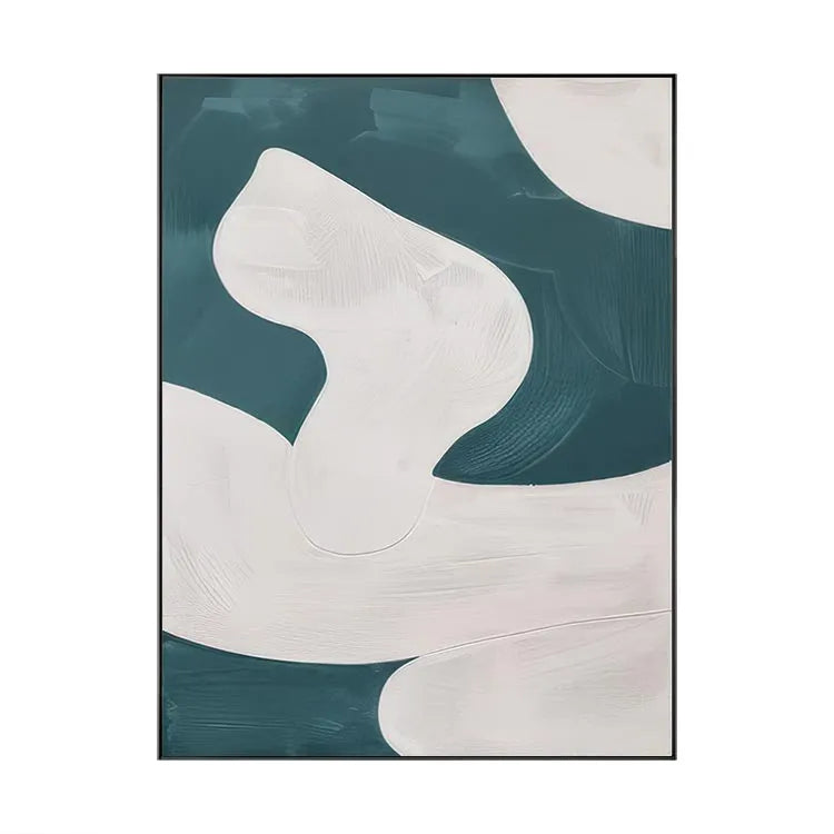This abstract painting employs a minimalist approach, characterized by its smooth, flowing forms and the interplay between white and teal hues. The composition features curvilinear, almost organic shapes that evoke a sense of movement and fluidity. The white forms, rendered with subtle gradations and delicate textures, contrast against the darker teal background, creating a dynamic yet harmonious balance. The brushstrokes are gentle and controlled, suggesting a digital or airbrush technique. The minimalist style and use of color are reminiscent of the Abstract Expressionism movement, but with a more restrained and modern approach. The lack of visible brushstrokes and the smooth transitions between colors emphasize the simplicity and elegance of the composition.