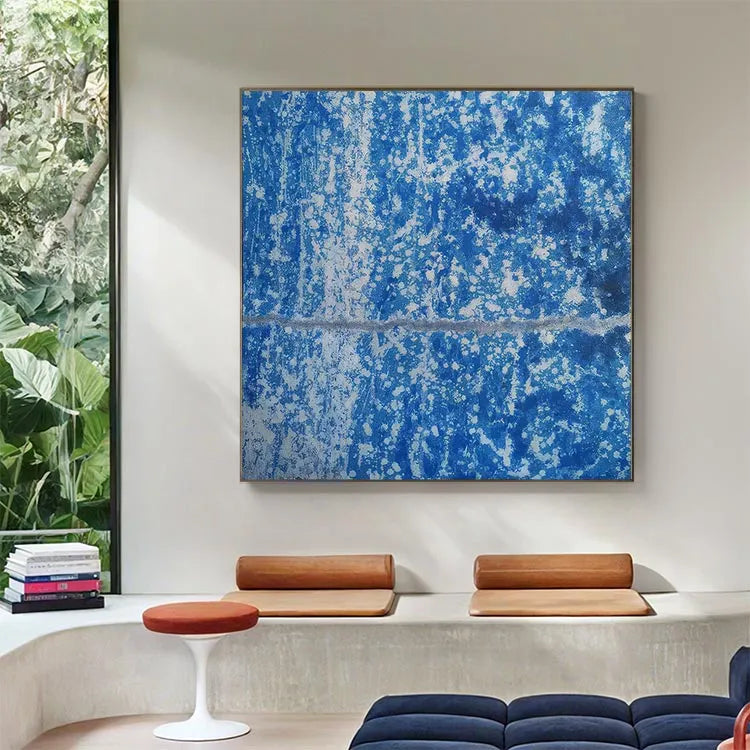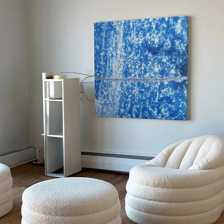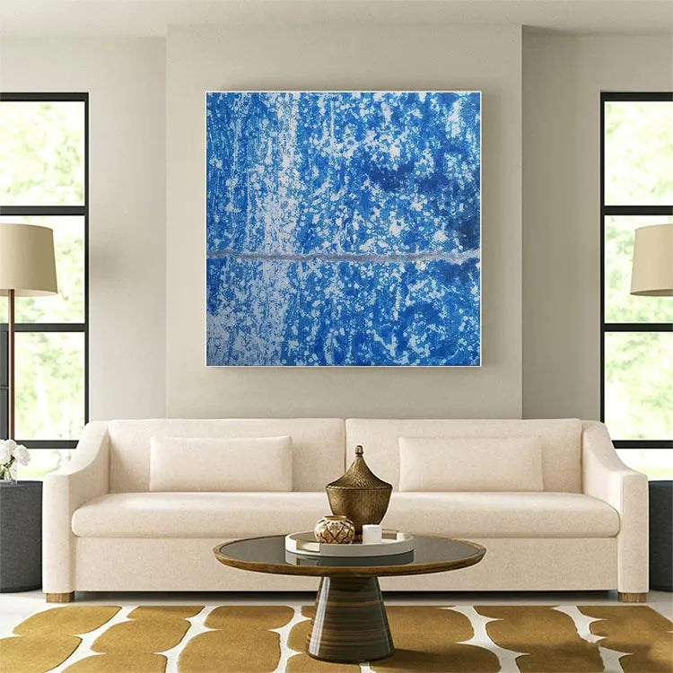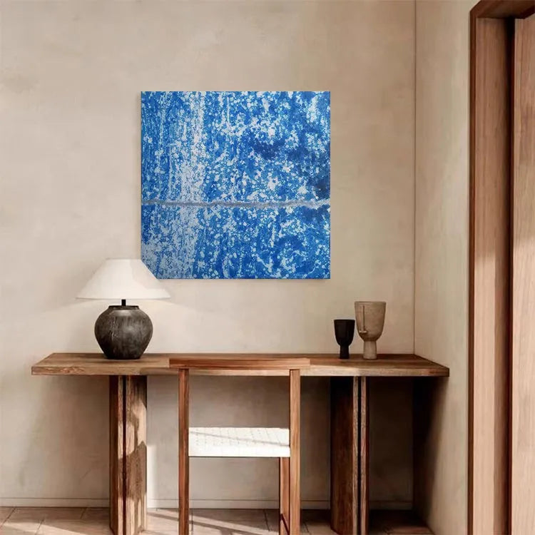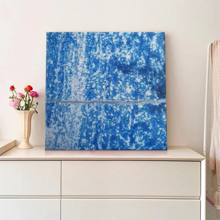 This abstract painting employs a textured, almost graffiti-like style, characterized by its rough, uneven application of paint. The dominant use of blue, interspersed with white, creates a dynamic interplay of light and shadow, suggesting depth and movement. The horizontal gray line bisecting the canvas adds a sense of balance and symmetry, contrasting with the chaotic, splattered patterns above and below. The rough texture, achieved through visible brushstrokes and possibly a squeegee, enhances the tactile quality of the piece. This work aligns with the Abstract Expressionism movement, emphasizing emotion and spontaneity over realism. The color palette and texture evoke a sense of urgency and energy, while the simplicity of the composition directs focus to the interplay between color and texture.