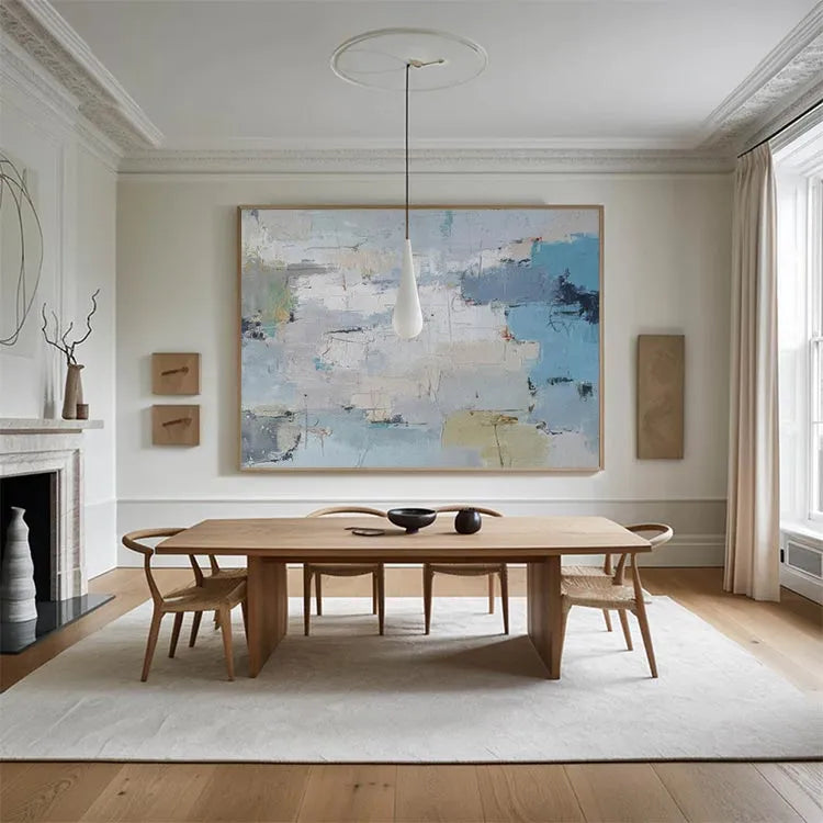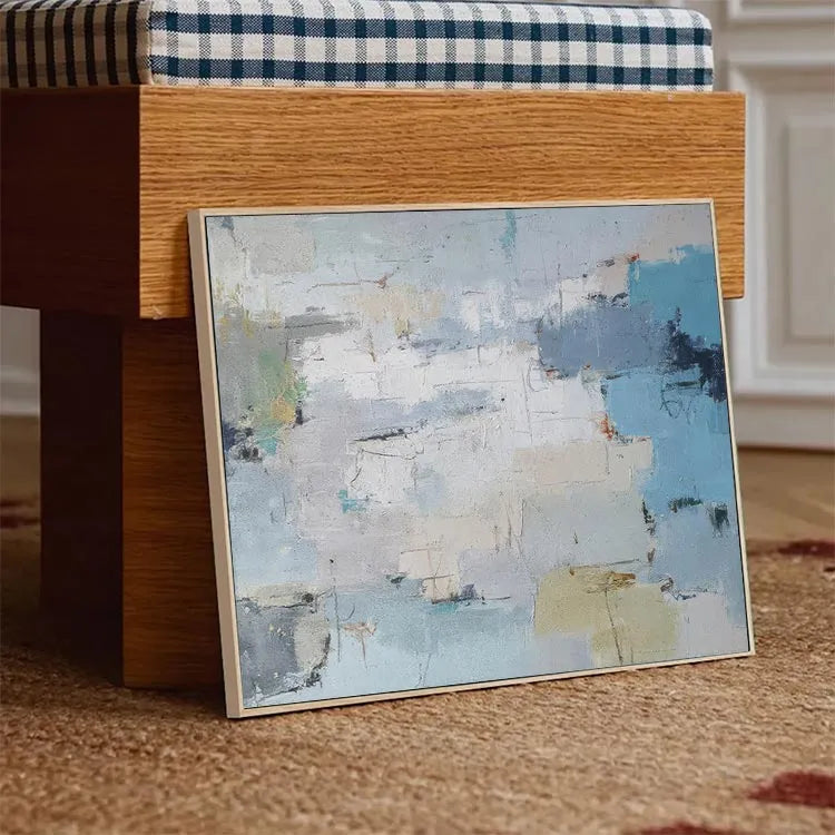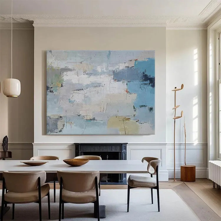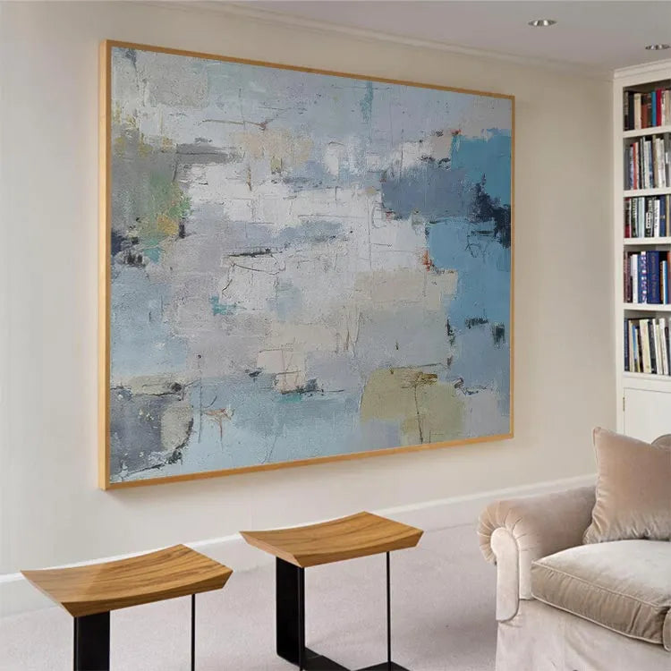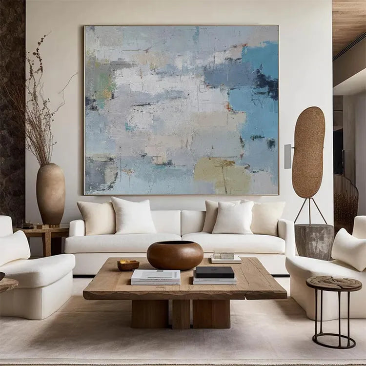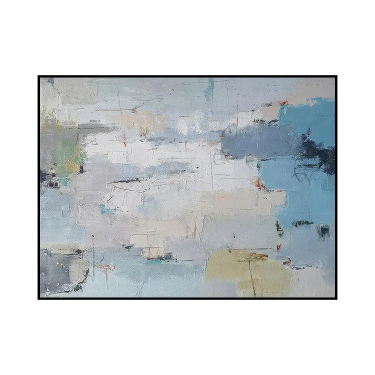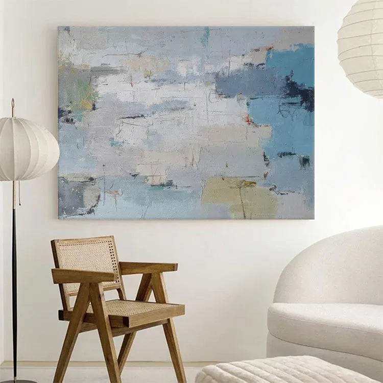 This oil painting exhibits a contemporary abstract style, characterized by its textured, layered composition and minimalistic use of color. The palette is subdued, featuring soft blues, grays, and beige, with occasional hints of orange, creating a serene yet complex visual experience. The texture is palpable, with visible brushstrokes and a rough, almost tangible surface that adds depth. The loose, fluid lines and the interplay between opaque and transparent layers suggest a sense of movement and spontaneity. The overall composition is non-representational, focusing on the interplay of color and texture rather than specific forms or figures. This work aligns with the Abstract Expressionism movement, emphasizing emotional and personal expression through abstract means.