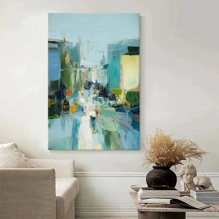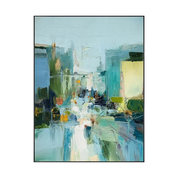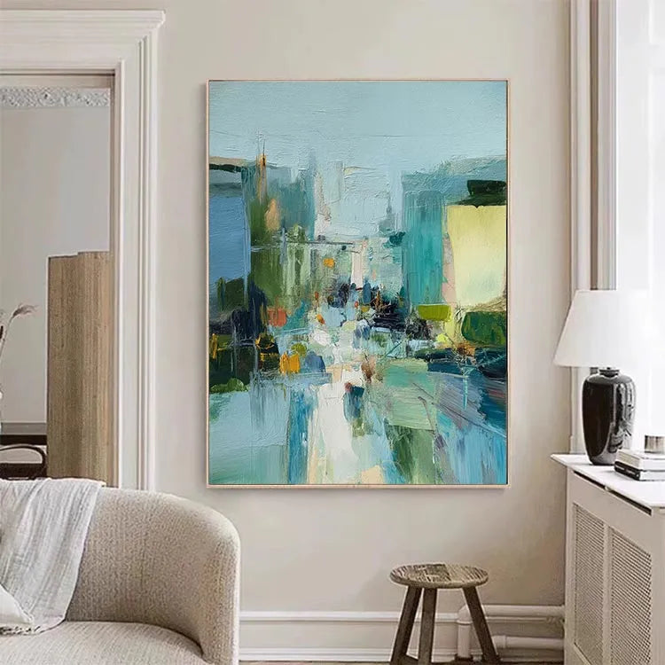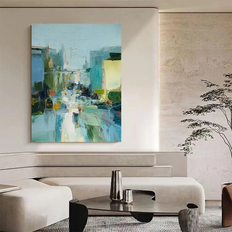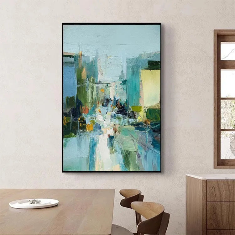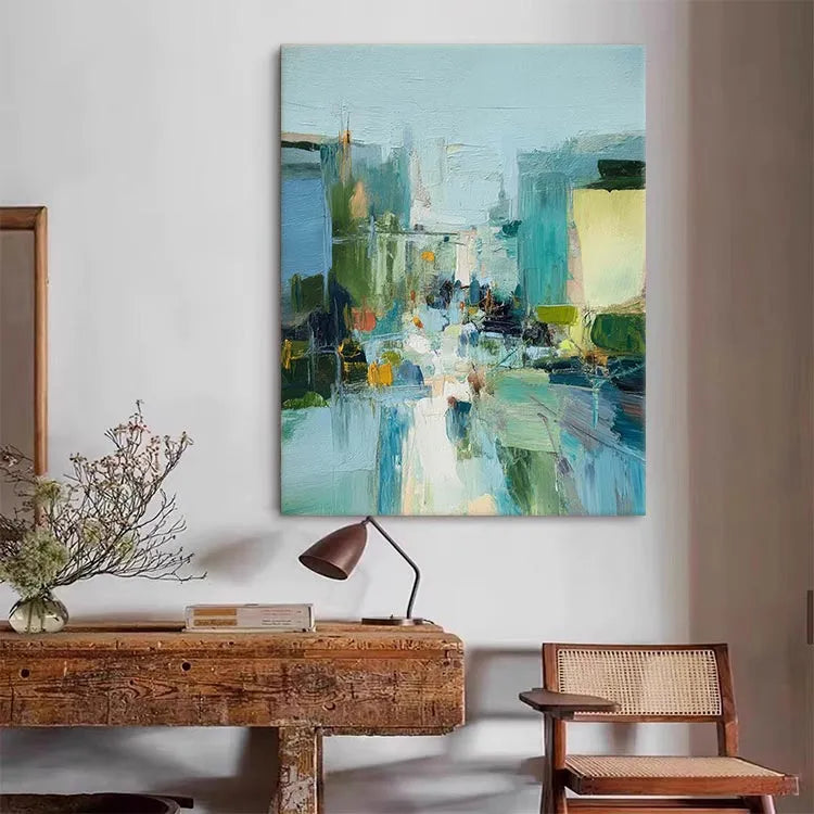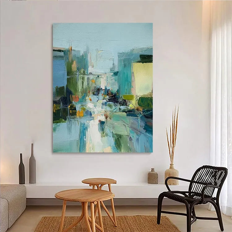 This abstract painting employs a vibrant, yet serene color palette dominated by blues, greens, and yellows. The textured brushstrokes create a sense of depth and movement, with thick, opaque layers of paint intersecting and overlapping. The composition suggests a cityscape, with loosely defined, geometric forms representing buildings. The use of light is subtle, with a gentle, diffused light source creating a calm atmosphere. The style is reminiscent of the Abstract Expressionism movement, with its emphasis on emotional expression and spontaneous creation. The textured, almost gridded application of paint adds a tactile quality, enhancing the visual complexity and dynamic energy of the piece.