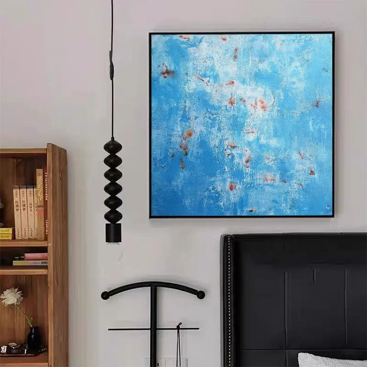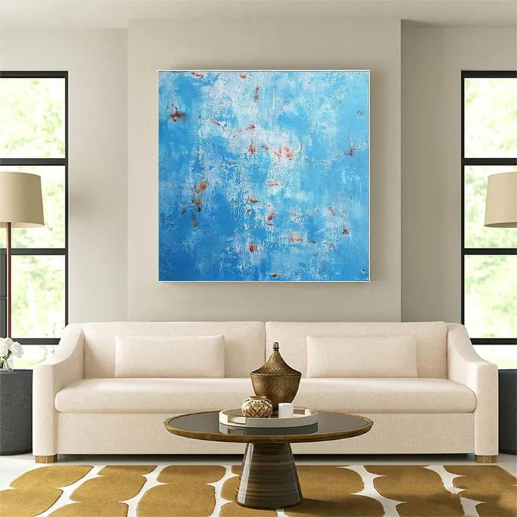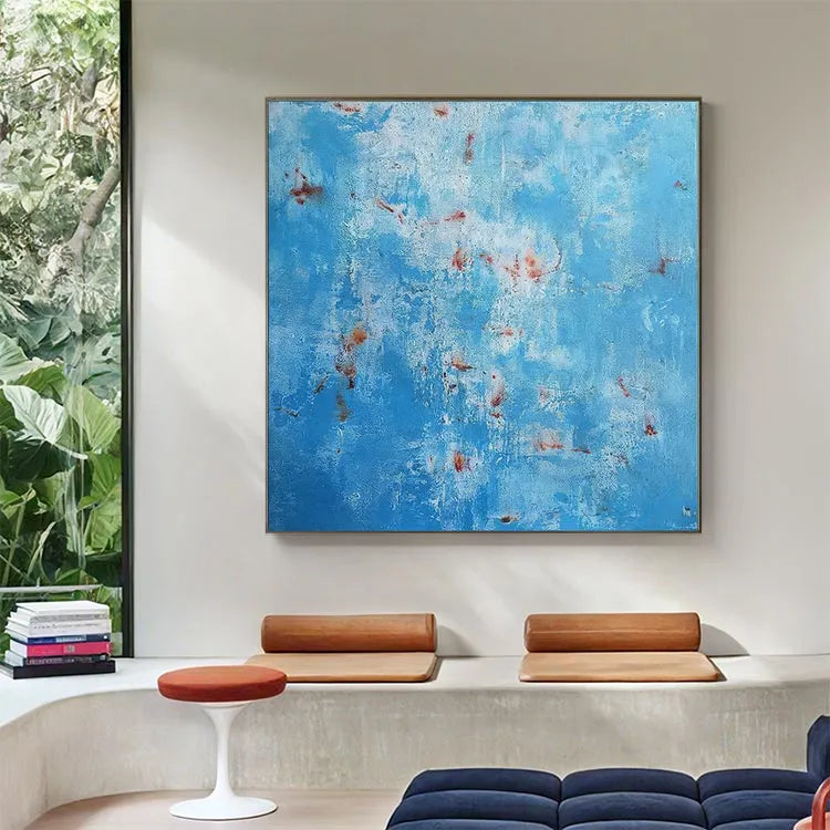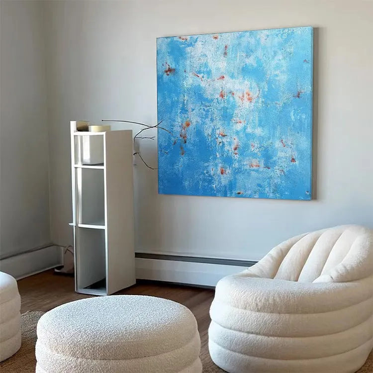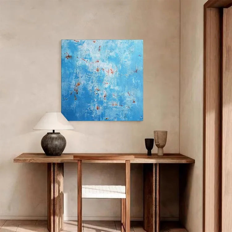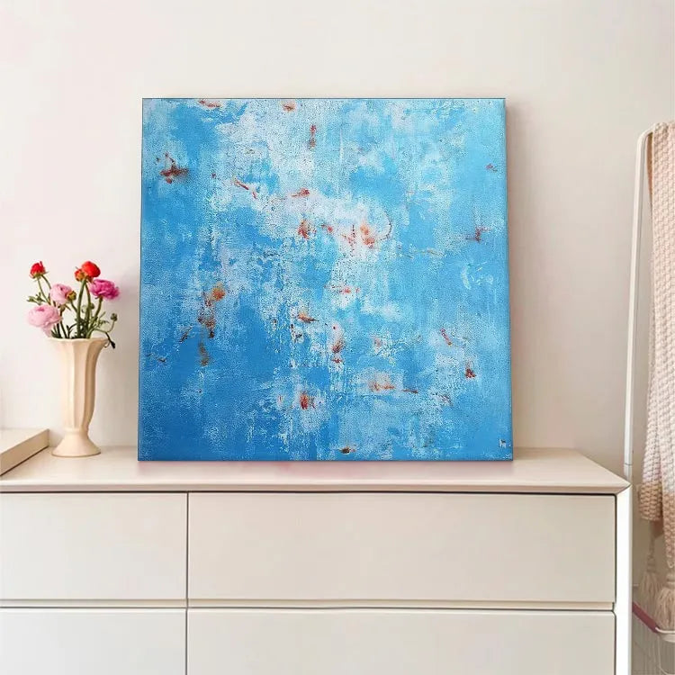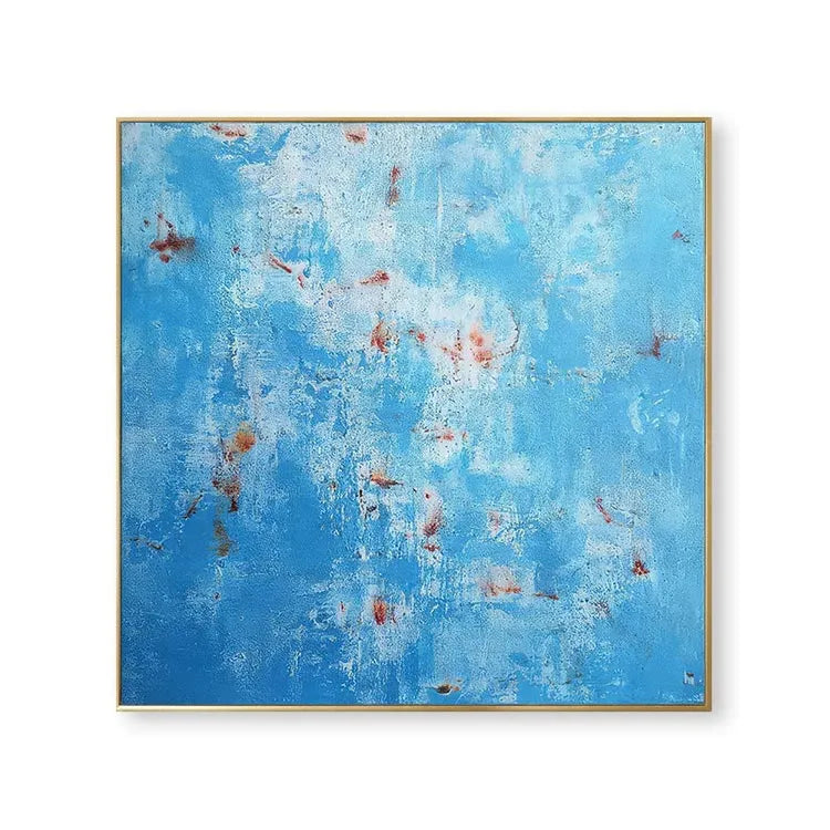 This painting, characterized by its abstract style, employs a vibrant blue palette as the primary color, evoking a sense of calm and openness. The texture is rough, with visible brushstrokes that create a distressed, almost weathered effect. Splashes of red and white punctuate the blue, adding dynamic contrast and suggesting movement or emotion. The use of color and texture recalls the Abstract Expressionism movement, with its emphasis on spontaneous creation and emotional expression. The subtle interplay of light and dark areas within the blue suggests depth and complexity, while the random red and white accents introduce a sense of spontaneity and unpredictability. The overall composition is balanced yet dynamic, inviting the viewer to explore its layers and textures.