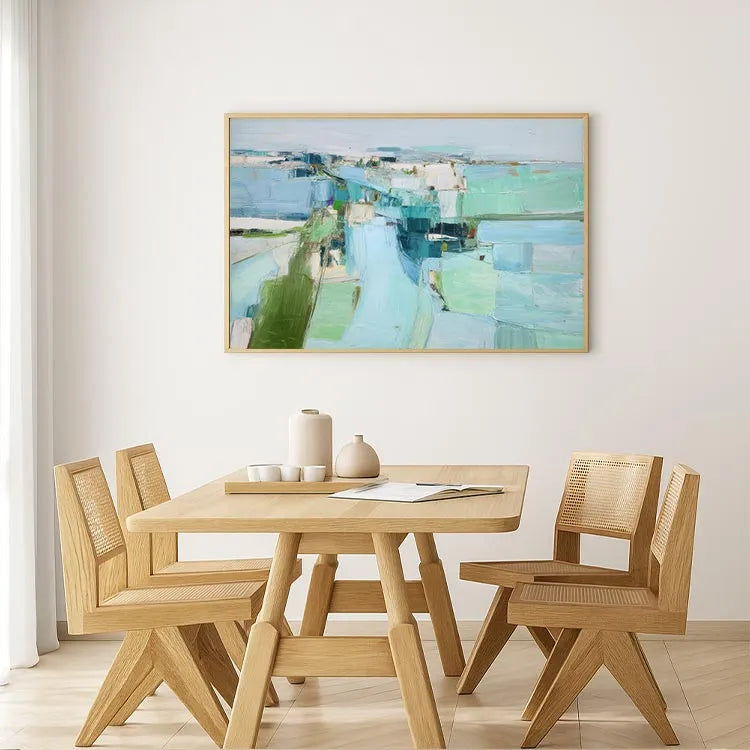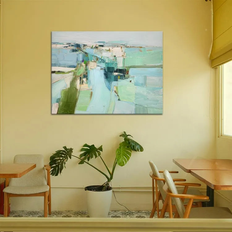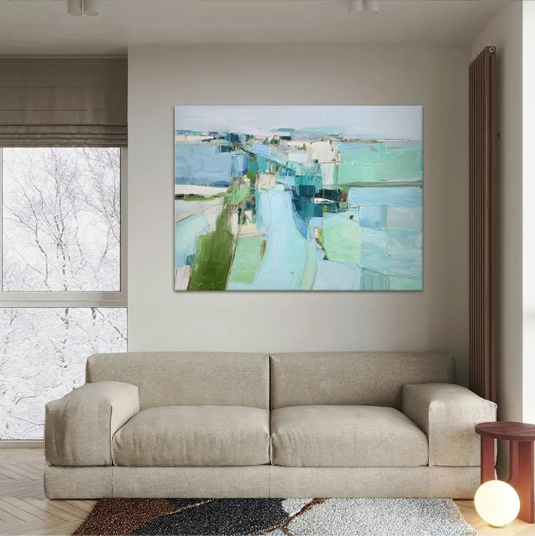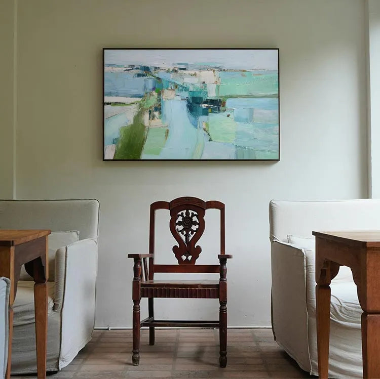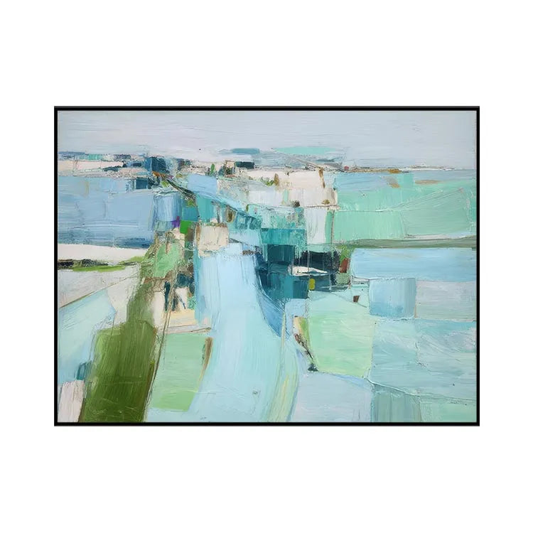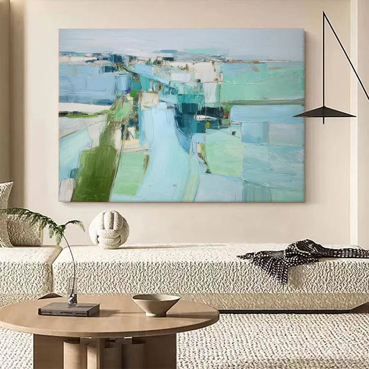 This abstract painting employs a minimalist, geometric style, characterized by its use of flat, rectangular shapes and a limited color palette of blues, greens, and whites. The brushstrokes are visible and textured, adding a sense of depth and movement to the composition. The light, airy application of colors suggests a serene, almost ethereal atmosphere. The interplay of cool and warm tones creates a subtle contrast, guiding the viewer's eye through the composition. The overall effect is reminiscent of the Color Field movement, with its emphasis on color and form over detail. The piece's simplicity and abstraction evoke a sense of tranquility and introspection.