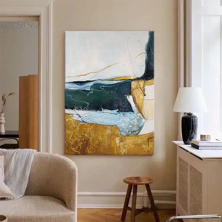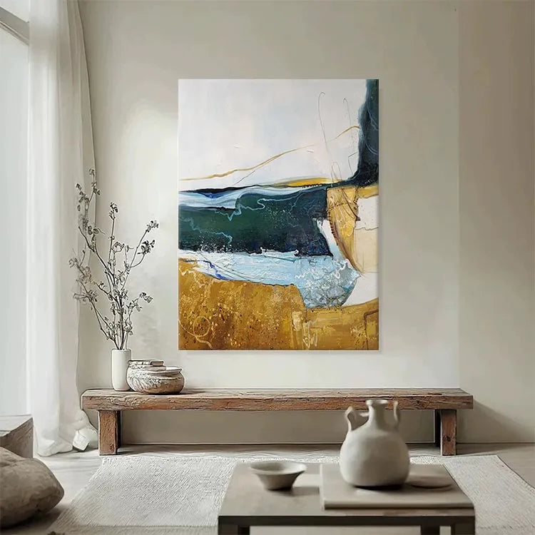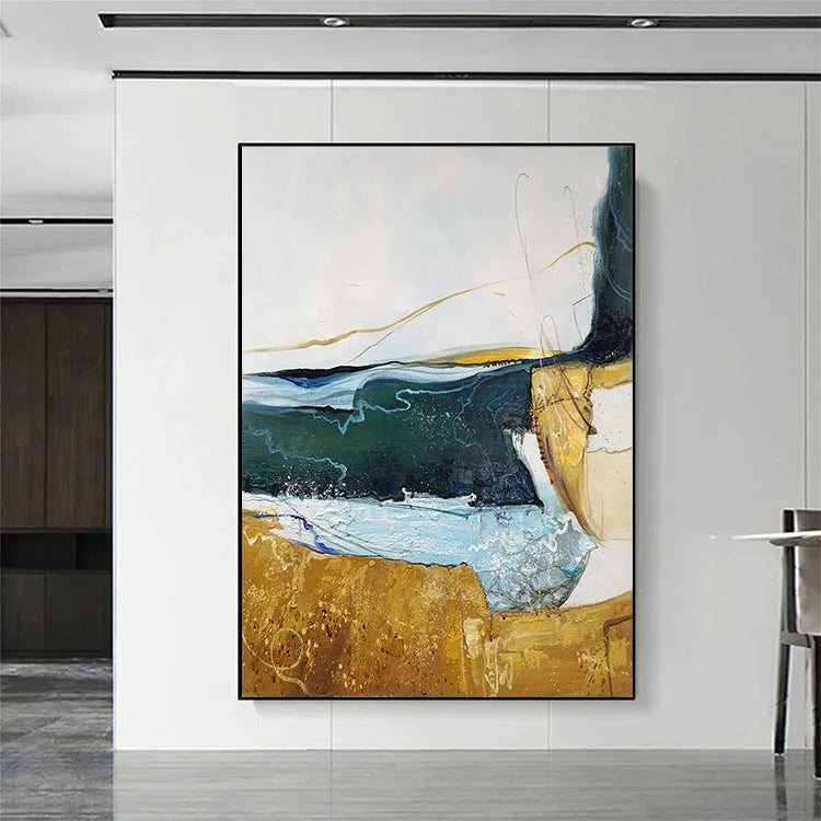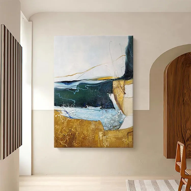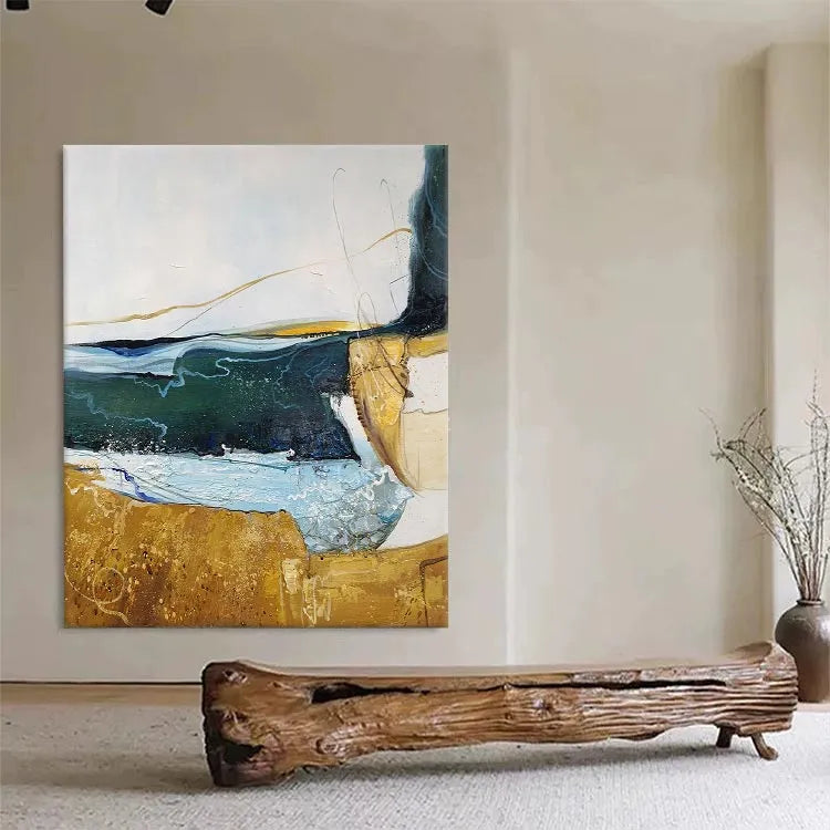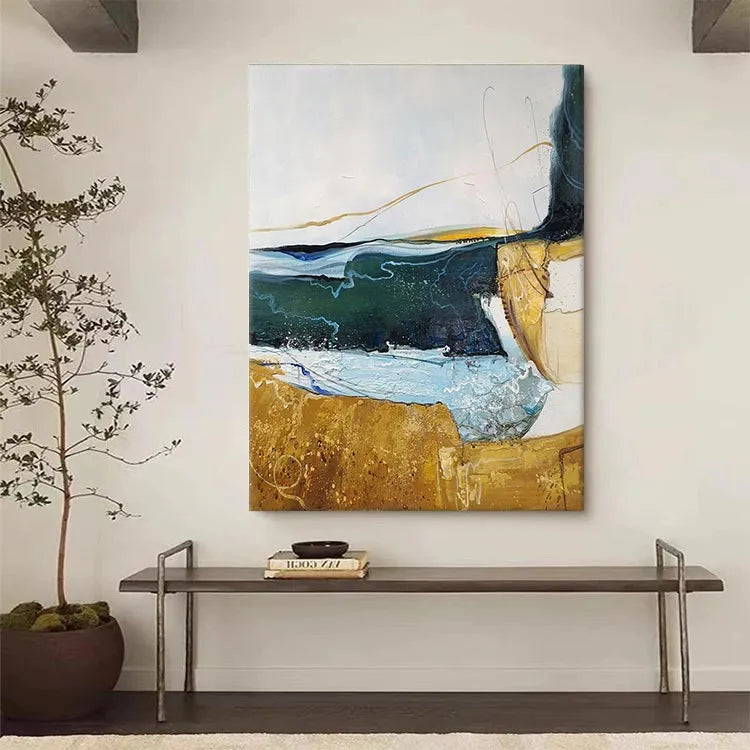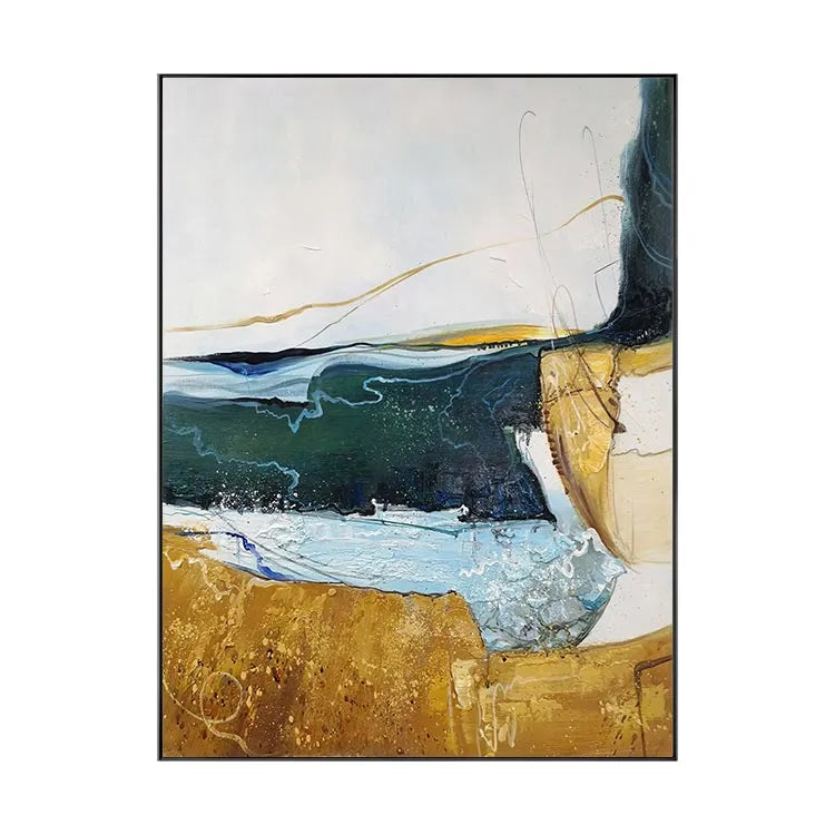 This abstract painting employs a dynamic interplay of color and texture, reminiscent of the Abstract Expressionist movement. The composition features a horizontal divide between a golden-brown, textured lower section and a upper section with fluid, layered brushstrokes in shades of blue, green, and white. The use of color suggests a juxtaposition between earthy stability and fluid, unpredictable nature. The textures, with visible brushstrokes and drips, add a sense of movement and spontaneity. The light, translucent layers of color create a sense of depth, while the golden-brown area anchors the composition. The subtle, curved lines and drips evoke a sense of organic form, enhancing the painting's fluid, expressive quality.