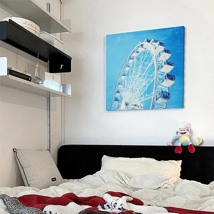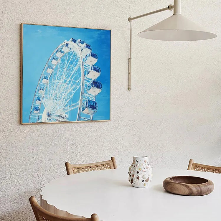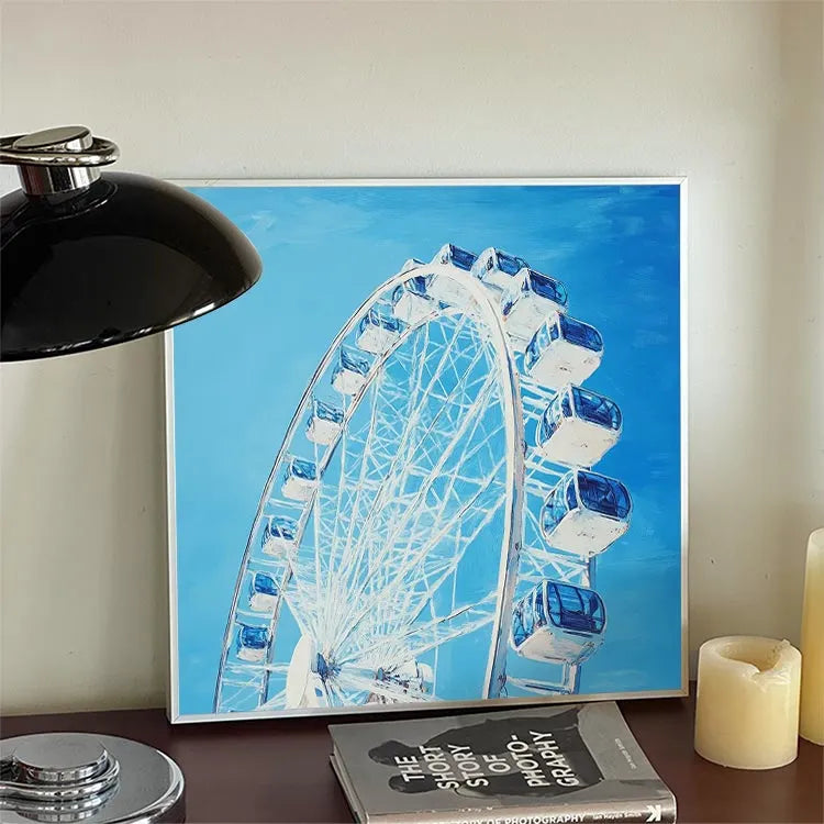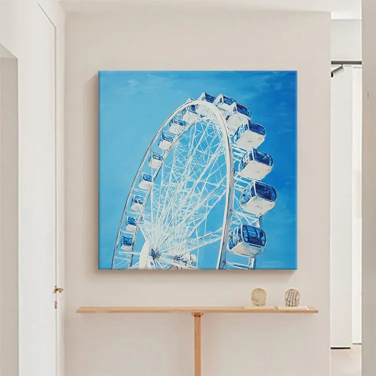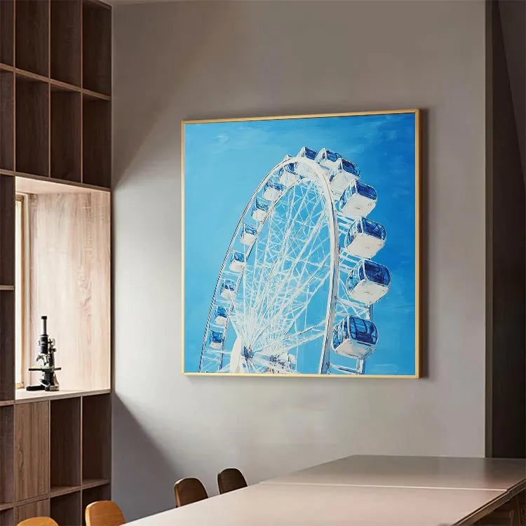 This oil painting depicts a Ferris wheel against a vibrant blue sky, utilizing a bright and vivid color palette that evokes a sense of joy and clarity. The artist employs a modern, almost abstract style, with smooth, visible brushstrokes that add texture to the white structure of the Ferris wheel. The clear, reflective surfaces of the gondolas contrast sharply with the solid blue background, creating a dynamic visual tension. The composition is balanced, with the Ferris wheel's curved lines and geometric patterns drawing the viewer's eye upward. The use of light and color suggests a celebration of modernity and leisure, potentially aligning with contemporary realism or pop art movements. The overall effect is both whimsical and sophisticated.