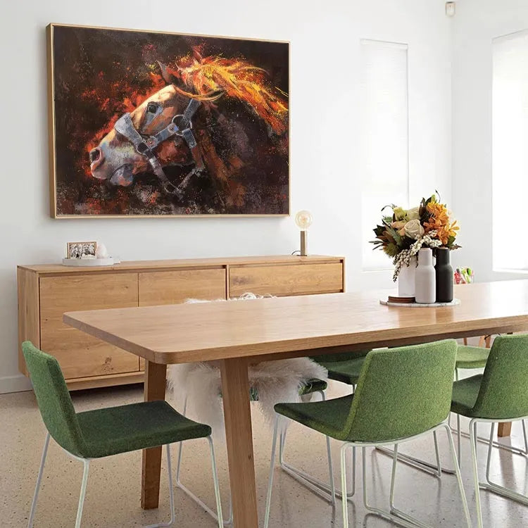 This oil painting of a horse's head, adorned with a metal bridle, exhibits a dynamic and expressive style. The composition centers on the horse's profile, with its fiery mane swirling dramatically, suggesting movement and energy. The use of color is striking, with vivid oranges and yellows in the mane contrasting against a dark, textured background. The light source appears to come from the upper right, casting a warm glow on the horse's face and highlighting its contours. The textured brushstrokes add a sense of depth and chaos, reminiscent of the Expressionist movement. The interplay between the horse's calm, structured bridle and its wild, untamed mane may symbolize the tension between control and freedom. The overall effect is both powerful and emotive, capturing the essence of the horse's spirit.
