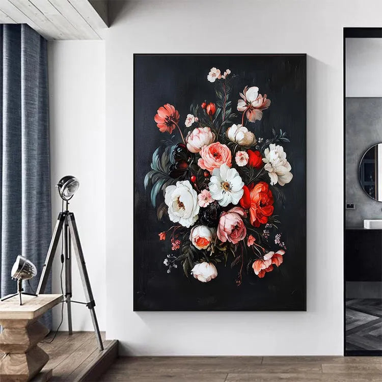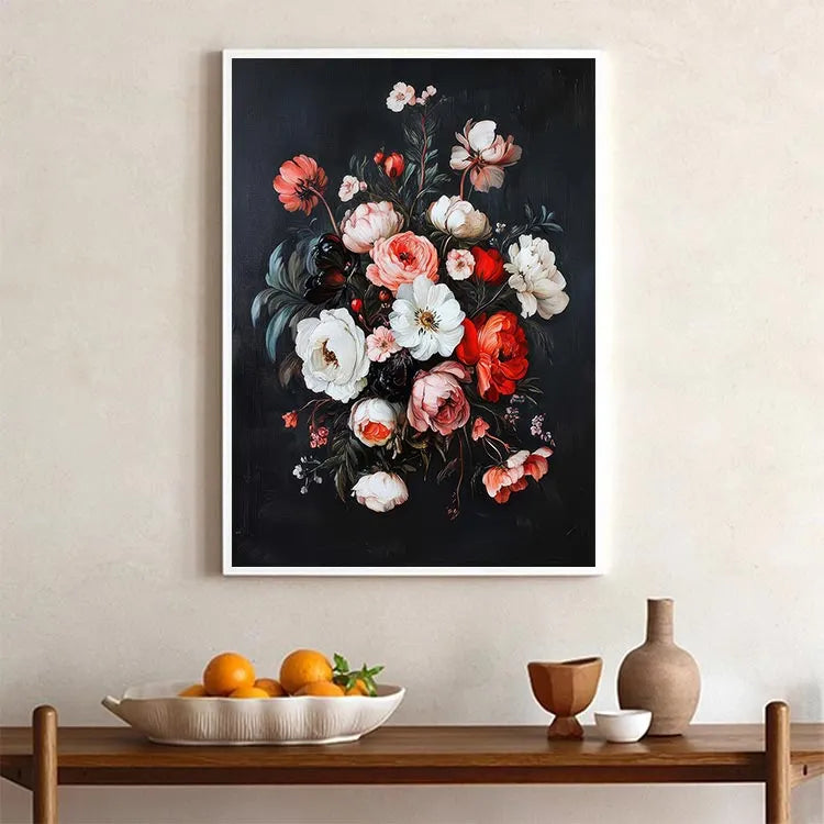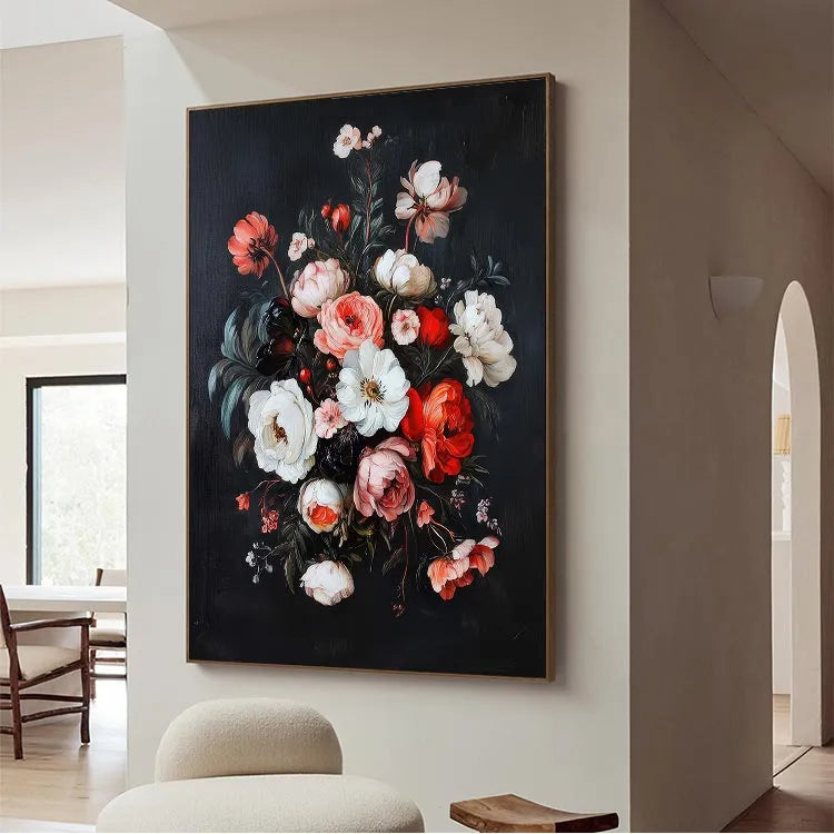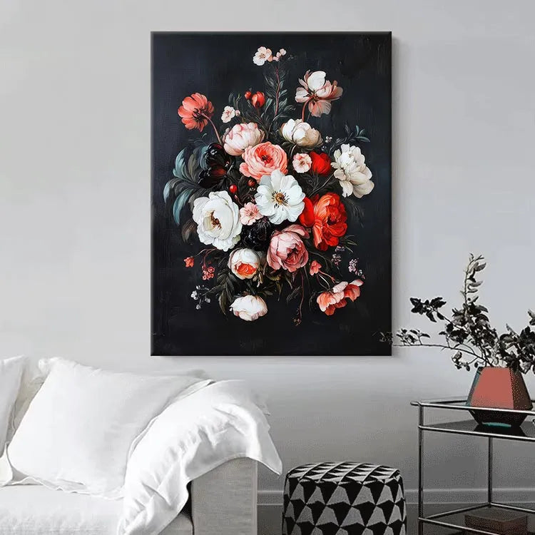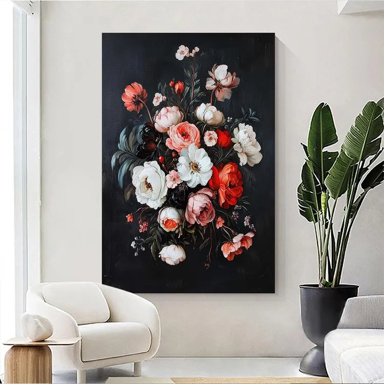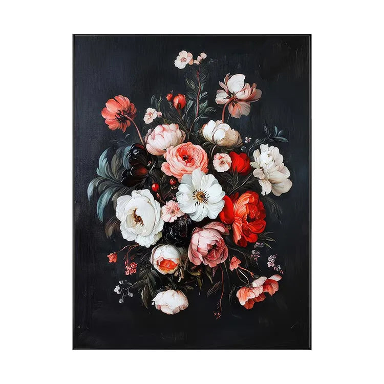 This oil painting, likely from the Baroque period, exemplifies the still life genre with its intricate and detailed floral arrangement. The composition is centralized, drawing the viewer's eye to the vibrant bouquet. The artist employs a rich, dark background that contrasts sharply with the bright, varied colors of the flowers, enhancing their visual impact. The use of color is masterful, with a palette that includes whites, pinks, reds, and subtle greens, creating a harmonious yet dynamic visual effect. Light is subtly implied through the delicate shading and highlights, giving the flowers a lifelike quality. The texture is smooth, with delicate brushstrokes that convey the delicate petals and leaves. The realistic style and attention to detail suggest influences from Dutch Golden Age still life artists.