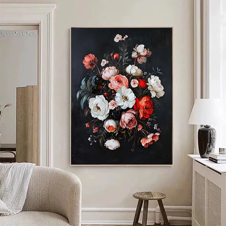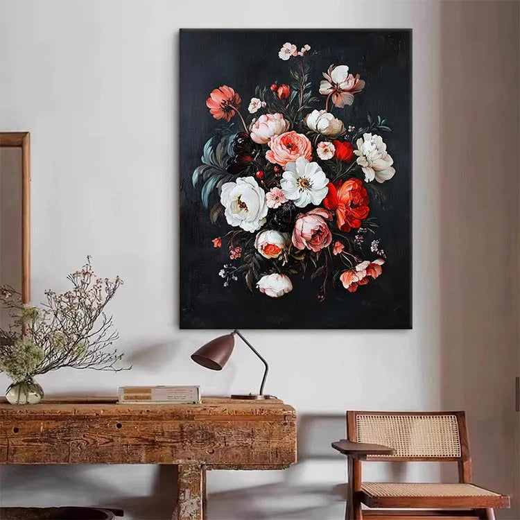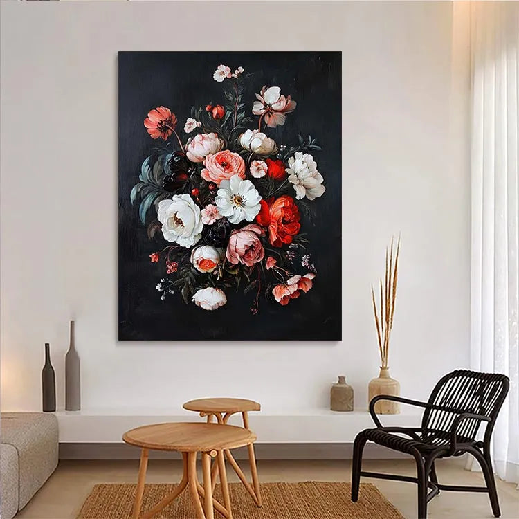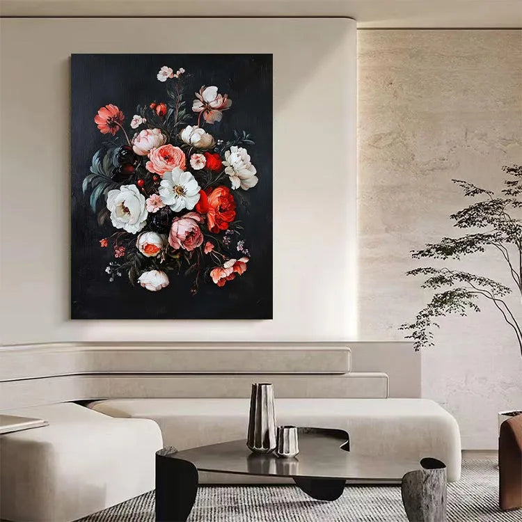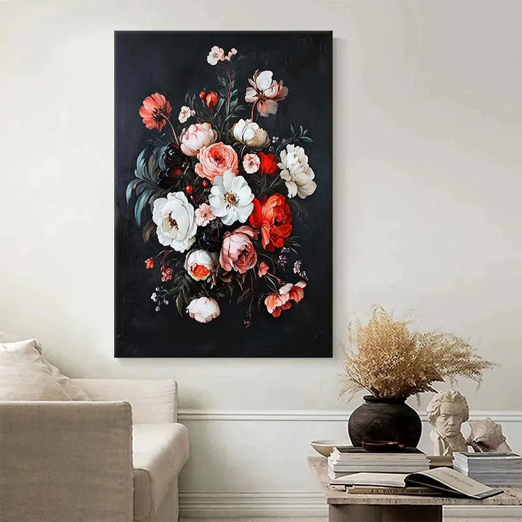 This painting exemplifies the Baroque style with its rich, detailed floral composition. The artist uses a dark, almost black background to highlight the vibrant colors of the flowers, creating a striking contrast. The flowers, with their delicate petals and varied textures, are meticulously rendered, showcasing a high level of realism. The use of color is particularly noteworthy, with the red, pink, and white flowers creating a harmonious yet dynamic palette. The light source appears to come from above, illuminating the central white flower and casting subtle shadows that add depth. The brushstrokes are delicate and precise, indicating a careful attention to detail. The composition is balanced yet dynamic, with a sense of movement among the petals. This work likely belongs to the 17th-century still-life tradition, reflecting the era's emphasis on natural beauty and realism.