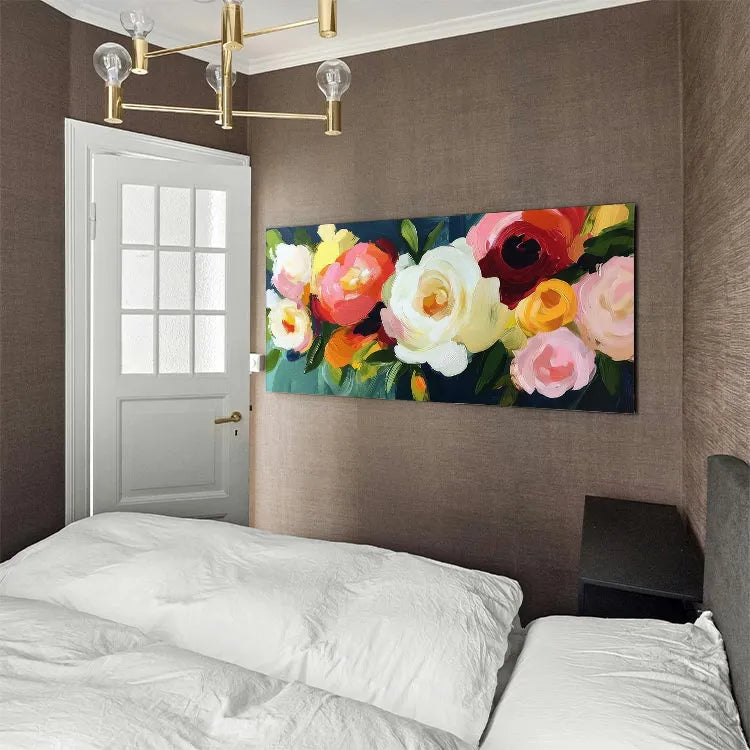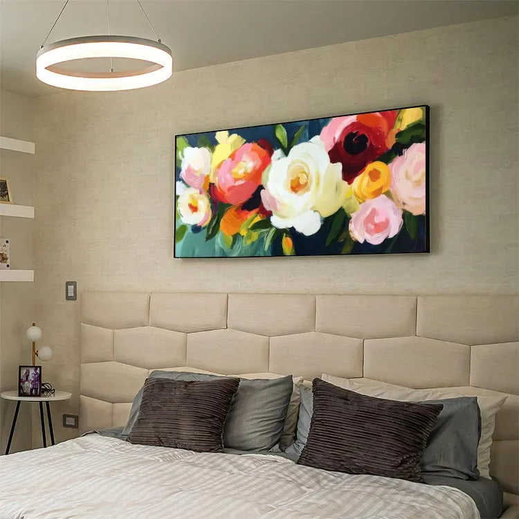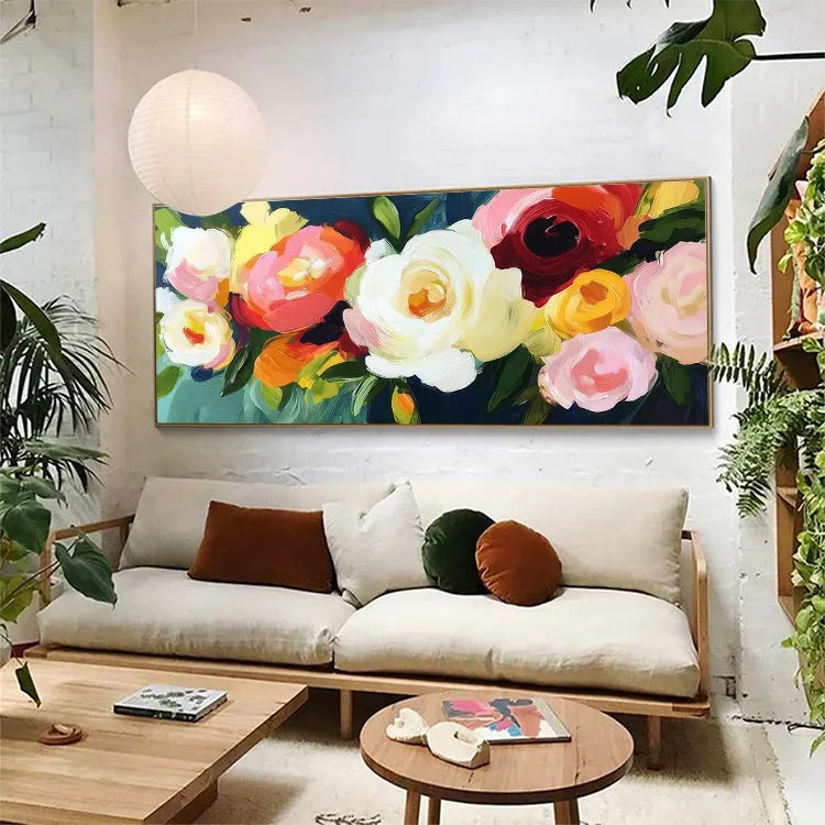 This vibrant floral painting employs a modern, impressionistic style with loose, expressive brushstrokes that convey a sense of movement and vitality. The artist uses a rich, contrasting color palette featuring vivid pinks, yellows, reds, and whites, which stand out against a deep, dark green background. The texture is dynamic, with visible, thick brushstrokes that create a tactile quality, enhancing the visual impact. The composition is balanced yet lively, with flowers of varying sizes and colors arranged in a harmonious, yet slightly chaotic manner, symbolizing natural beauty and spontaneity. The light source appears diffuse, highlighting the delicate petals and creating subtle gradients within the flowers. This piece may belong to the contemporary realism movement, with its focus on vivid color and expressive texture.