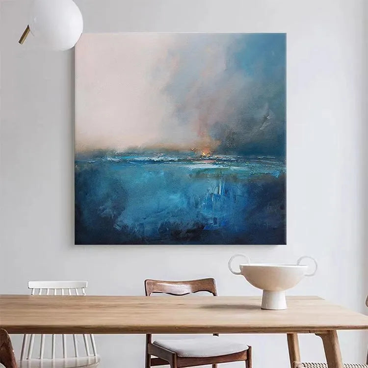 This painting exhibits a serene yet dynamic seascape, characterized by a fluid, impressionistic style. The artist employs a delicate balance of cool and warm colors, with dominant blues and subtle pinks and oranges. The light source, likely the setting or rising sun, creates a soft, ethereal glow that diffuses across the sky and water. The textured brushstrokes add a sense of movement, with the darker, more opaque blues in the foreground contrasting with the lighter, more translucent colors in the background. This juxtaposition suggests depth and distance. The overall composition evokes a tranquil yet mysterious atmosphere, aligning with the romanticism movement, emphasizing nature's sublime beauty and emotional impact.