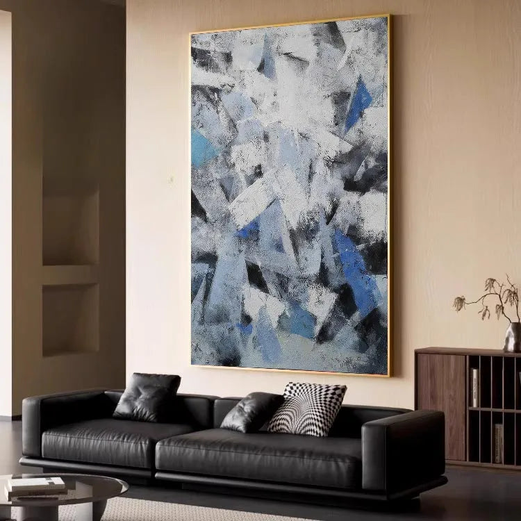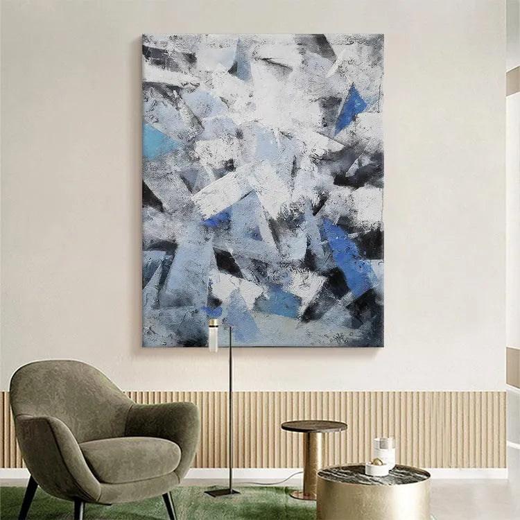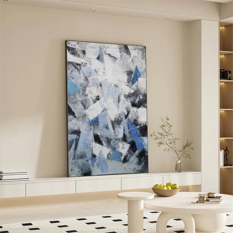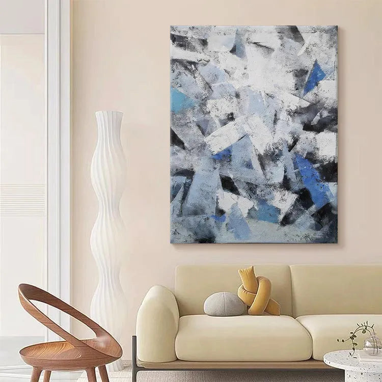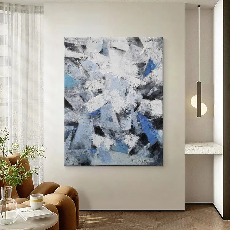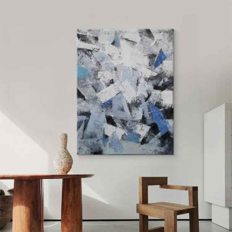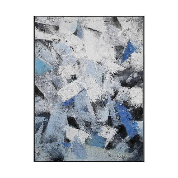 This oil painting showcases a dynamic abstract composition characterized by jagged, geometric forms in shades of white, blue, and black. The use of color is restrained yet effective, with the blue accents providing a focal point amidst the predominantly white and gray forms. The textured brushstrokes and visible paint layers add depth and complexity to the piece, suggesting a sense of movement and fragmentation. The light source is ambiguous, creating a subtle interplay between light and shadow that enhances the three-dimensional quality of the shapes. The style aligns with Abstract Expressionism, with its emphasis on form and emotion over representation. The artist's signature in the bottom right corner indicates a personal touch and authenticity.