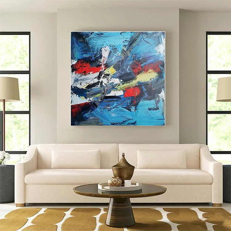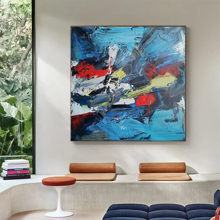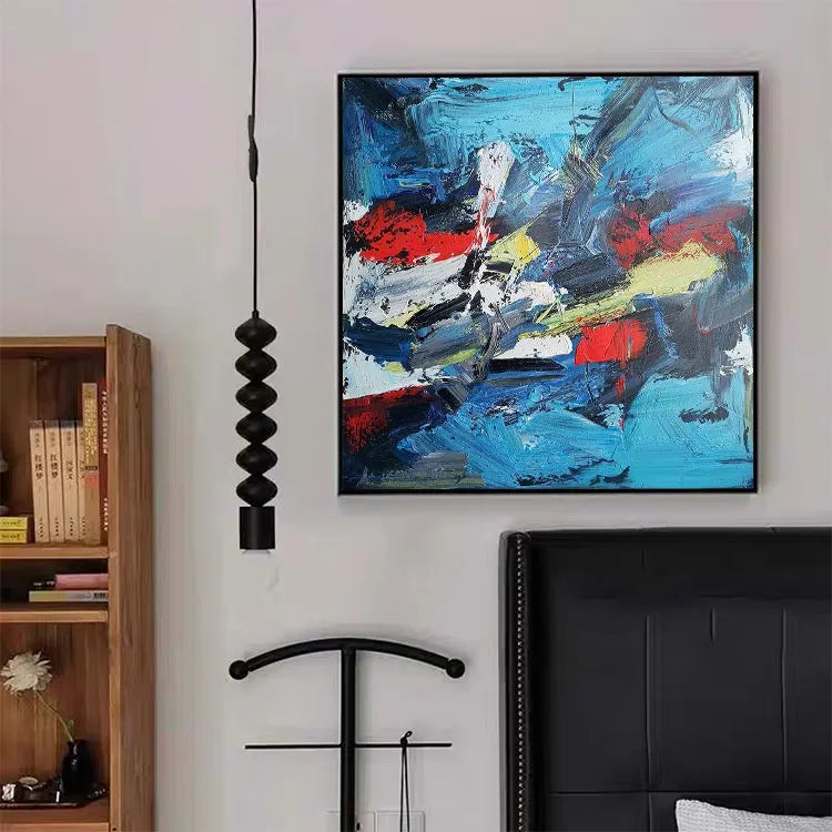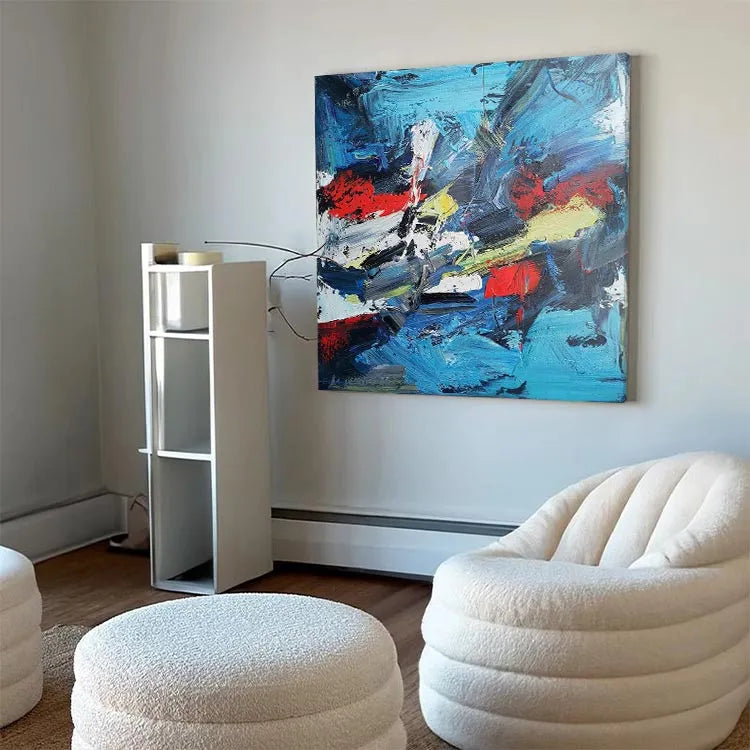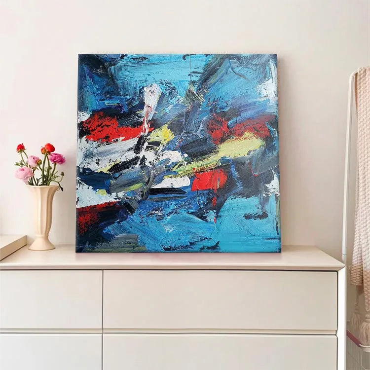 This abstract painting exhibits a dynamic and chaotic composition, characterized by thick, expressive brushstrokes and a vibrant color palette. The use of bold reds, blues, and yellows creates a striking contrast, evoking a sense of tension and movement. The texture is palpable, with visible, rough brushstrokes that add a tactile quality to the piece. The interplay of light and dark areas suggests depth and complexity. This work aligns with the Abstract Expressionism movement, emphasizing emotion and spontaneity over representation. The chaotic arrangement of colors and forms may symbolize the disorder and complexity of modern life. The artist's bold, energetic style reflects a commitment to the raw and unfiltered expression of human experience.