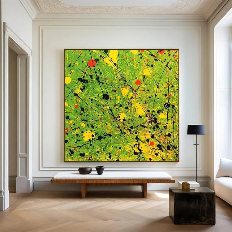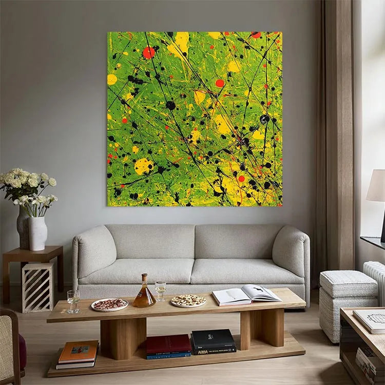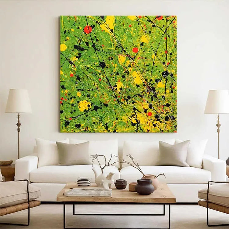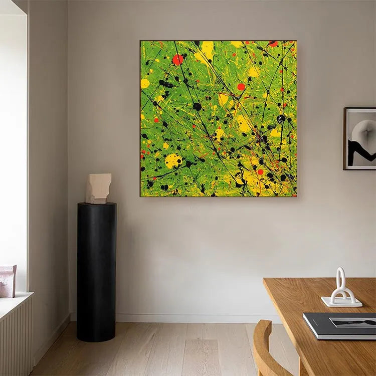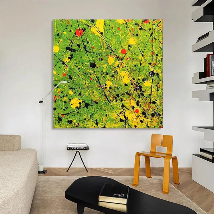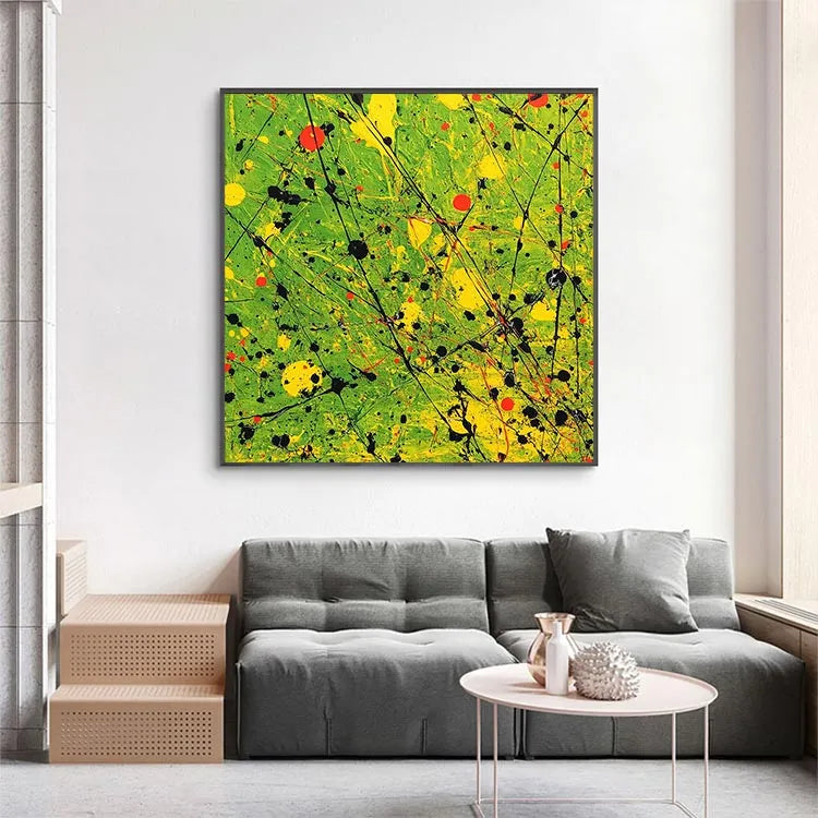 This abstract painting features a vibrant, chaotic composition characterized by dynamic splashes of yellow, red, and black against a lush green background. The use of color creates a vivid, energetic atmosphere, while the black lines and splatters introduce a sense of movement and disorder. The texture is rich with visible brushstrokes and paint drips, suggesting spontaneity and the physical act of painting. The interplay between the bright, primary colors and the green suggests a lively, natural environment. This work is reminiscent of the Abstract Expressionist movement, with its emphasis on emotion and spontaneity, and can be compared to the works of artists like Jackson Pollock or Mark Rothko. The overall effect is both chaotic and harmonious, drawing the viewer into its vibrant, textured surface.