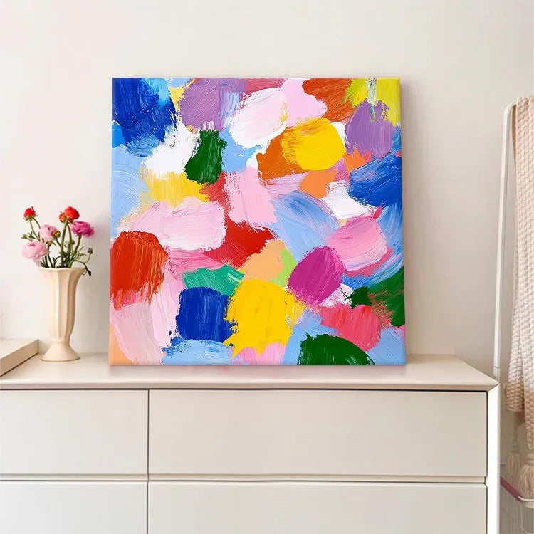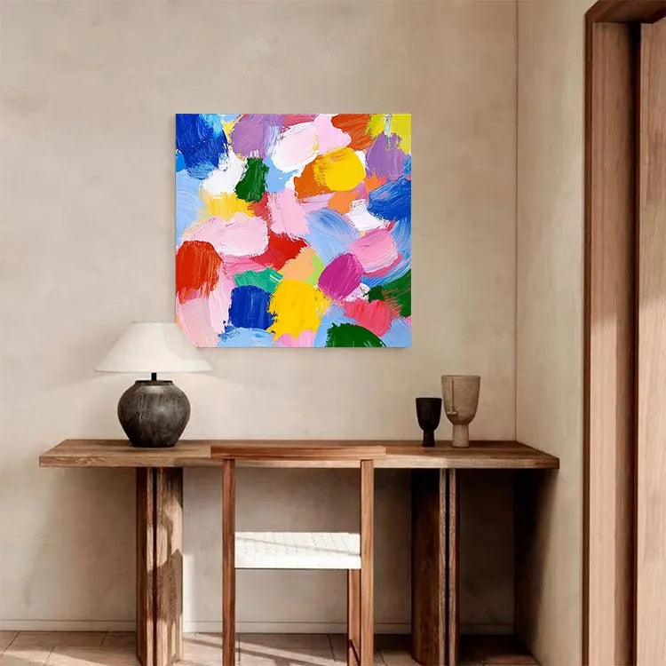 This vibrant abstract painting features a dynamic interplay of color and texture, reminiscent of the Expressionist movement. The artist employs thick, expressive brushstrokes, creating a sense of movement and energy. The palette is rich and varied, with bold hues of red, blue, yellow, pink, and green intersecting in a chaotic yet harmonious manner. The use of color is both spontaneous and deliberate, evoking emotions and drawing the viewer's eye across the canvas. The texture of the brushstrokes is palpable, with visible ridges and strokes adding depth and tactile quality to the piece. The lack of a central focus or defined forms suggests a celebration of color and form over representational accuracy, aligning with the abstract expressionist ethos.
