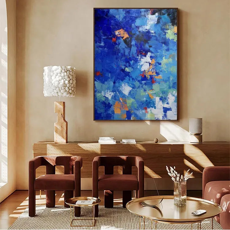 This oil painting exhibits a vibrant, abstract composition characterized by a dynamic interplay of colors and textures. The dominant use of blue, accented by orange and white, creates a sense of depth and movement. The brushstrokes are bold and textured, adding a tactile quality to the canvas. The artist employs a non-representational style, reminiscent of the Abstract Expressionism movement, with an emphasis on emotion and spontaneity. The juxtaposition of cool and warm colors, along with the varied brushstrokes, suggests a balance between chaos and order. The painting's rough, layered textures and spontaneous application of paint convey a sense of energetic motion, inviting the viewer to explore its complex, multifaceted nature.