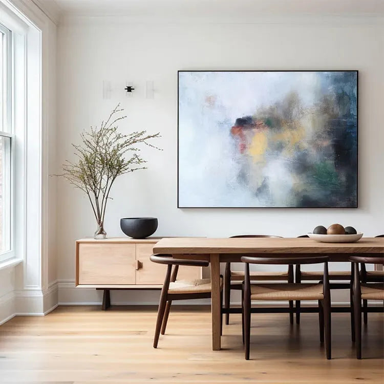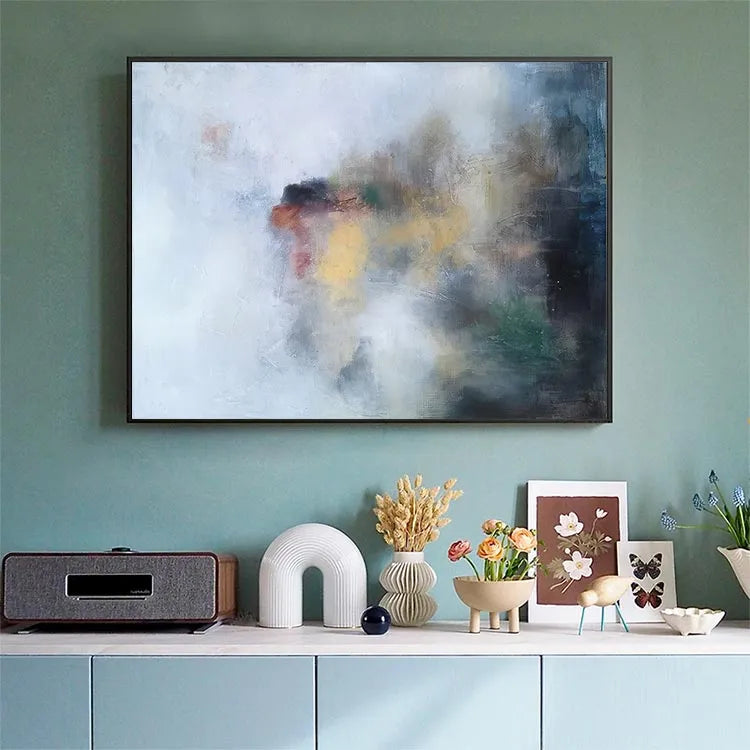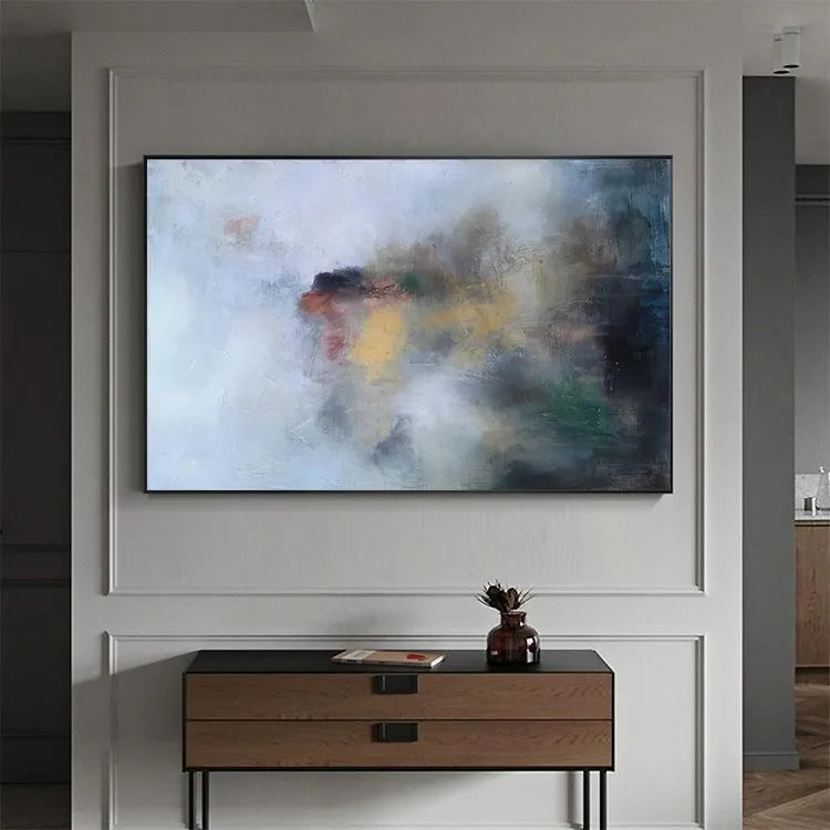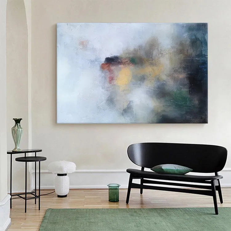 This oil painting employs a minimalist, abstract style, characterized by its soft, diffused brushstrokes and subtle color palette. The composition is non-representational, with a central, indistinct blotch of red, yellow, and green hues, set against a predominantly white and gray background. The use of light is delicate, with the colors blending seamlessly into one another, creating a sense of depth and movement. Textural elements, such as visible brushstrokes and a slightly roughened canvas surface, add a tactile quality to the piece. The overall effect is reminiscent of the Abstract Expressionism movement, with its emphasis on emotional expression and spontaneous creation. The painting invites the viewer to interpret its abstract forms and colors, evoking a sense of mystery and introspection.