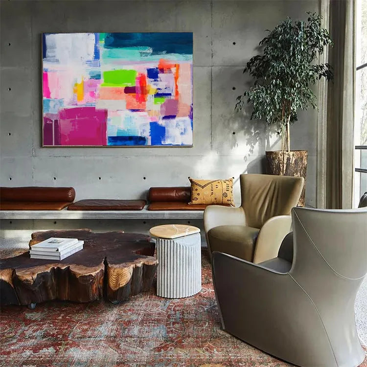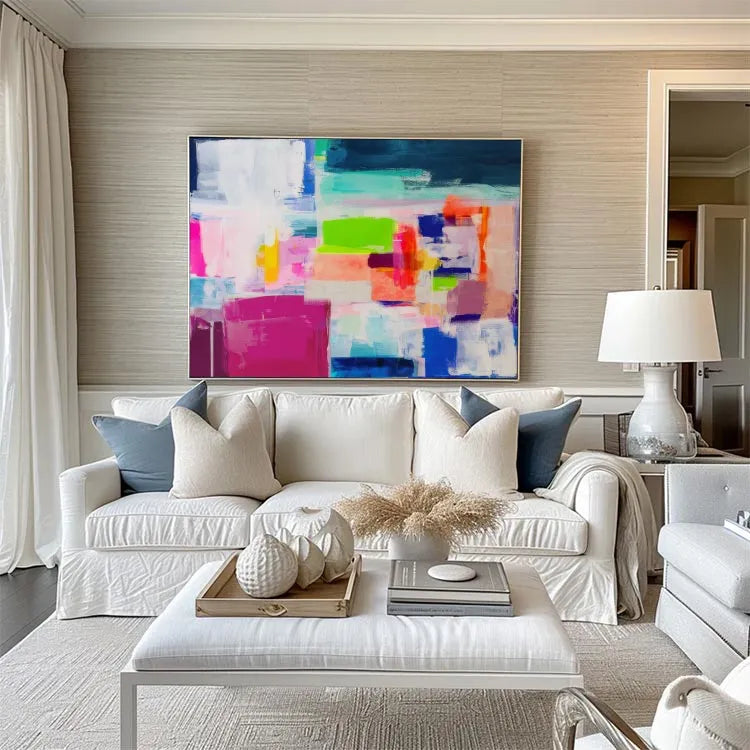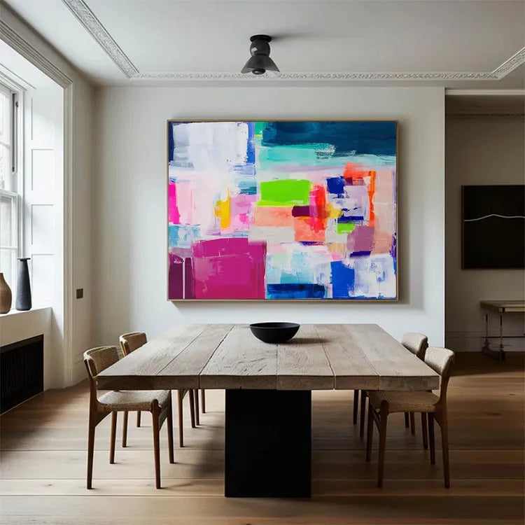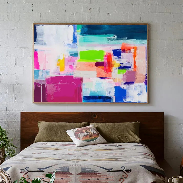 This abstract oil painting features a vibrant, chaotic composition with a dynamic interplay of color and texture. The artist employs thick, expressive brushstrokes, creating a sense of movement and energy. Bright, neon colors—such as lime green, magenta, and orange—contrast sharply with cooler tones like blue and white, drawing the viewer's eye across the canvas. The texture is palpable, with visible brushstrokes adding a tactile quality. The use of color suggests a celebration of modernism and abstraction, reminiscent of the Fauvist movement. The lack of discernible forms or figures allows for a focus on the emotional impact of color and texture, rather than narrative. The overall effect is lively and immersive, inviting the viewer to explore the interplay of color and form.