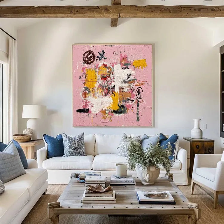 This abstract painting exhibits a vibrant, chaotic composition with a pink background that serves as a unifying element. The use of bold, textured brushstrokes in yellow, white, and black creates a dynamic interplay of colors and textures, reminiscent of Abstract Expressionism. The thick, impasto application of paint adds a tactile quality, enhancing the visual complexity. The random placement of shapes and colors suggests spontaneity and emotional intensity. The interplay between the rough, textured brushstrokes and the smooth, flat areas of color creates a sense of movement and depth. The overall effect is energetic and expressive, inviting viewers to interpret the abstract forms and colors symbolically.
