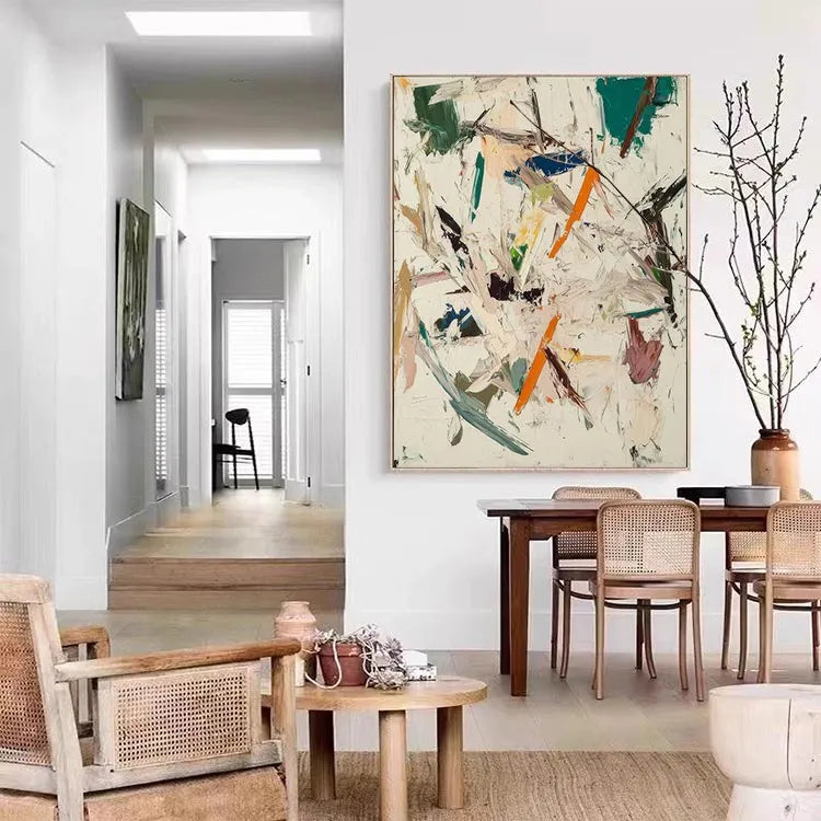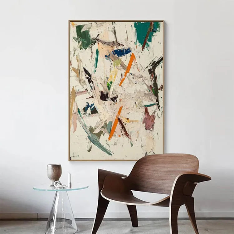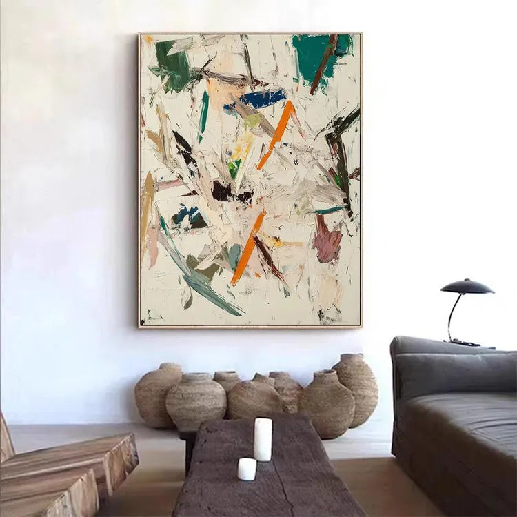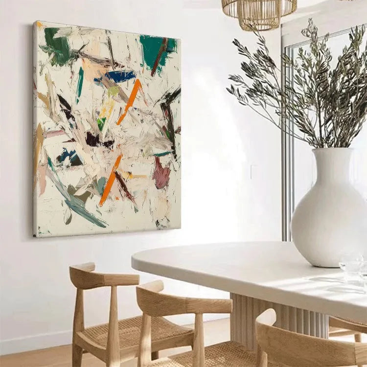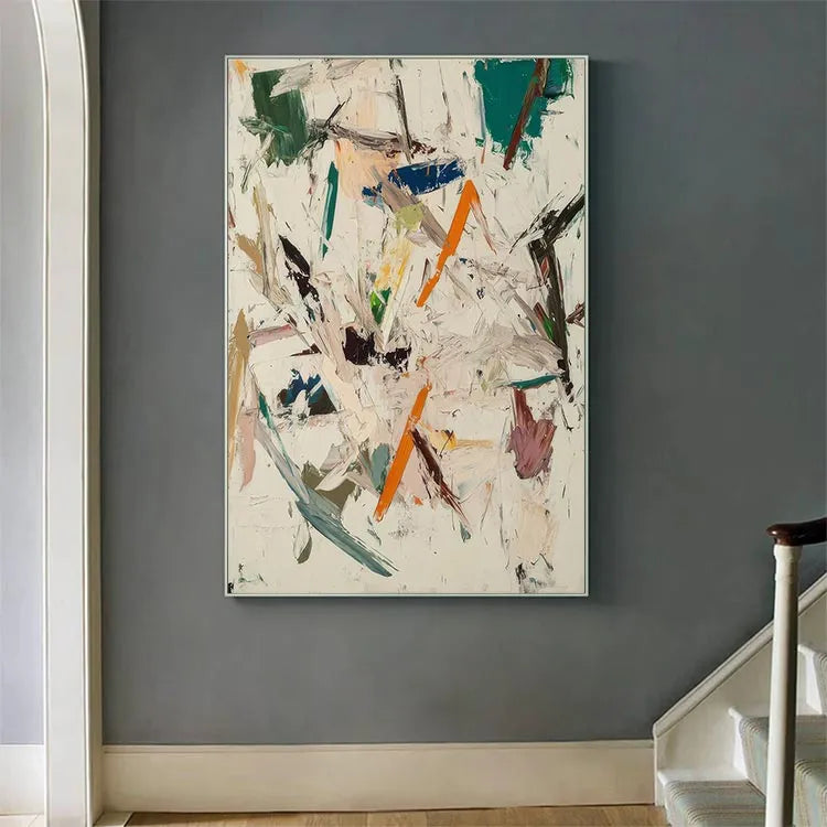 This abstract painting employs a dynamic, chaotic composition with a multitude of brushstrokes and color accents. The use of thick, expressive brushstrokes creates a textured, almost three-dimensional effect. The color palette is diverse, featuring vibrant oranges, deep blues, muted greens, and earthy browns, which contrast against a predominantly white background. The orange diagonal lines stand out, drawing the viewer's eye through the composition. The overall style suggests influences of Abstract Expressionism, characterized by spontaneous and emotive brushwork. The painting's texture, with visible brushstrokes and layered paint, adds depth and complexity, while the random yet deliberate placement of colors and lines may symbolize the disorder or complexity of modern life.