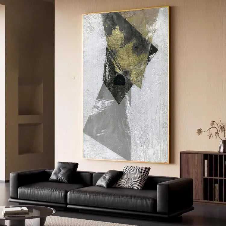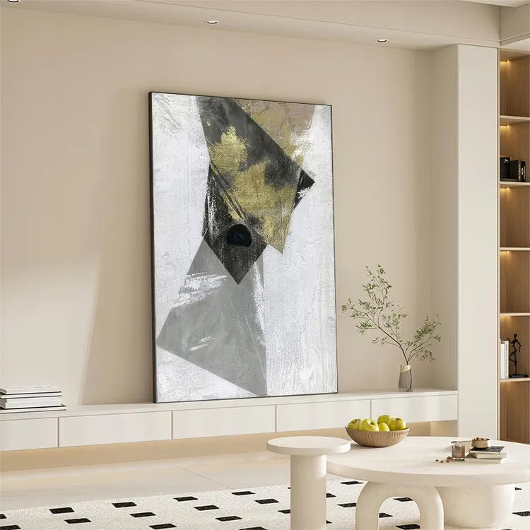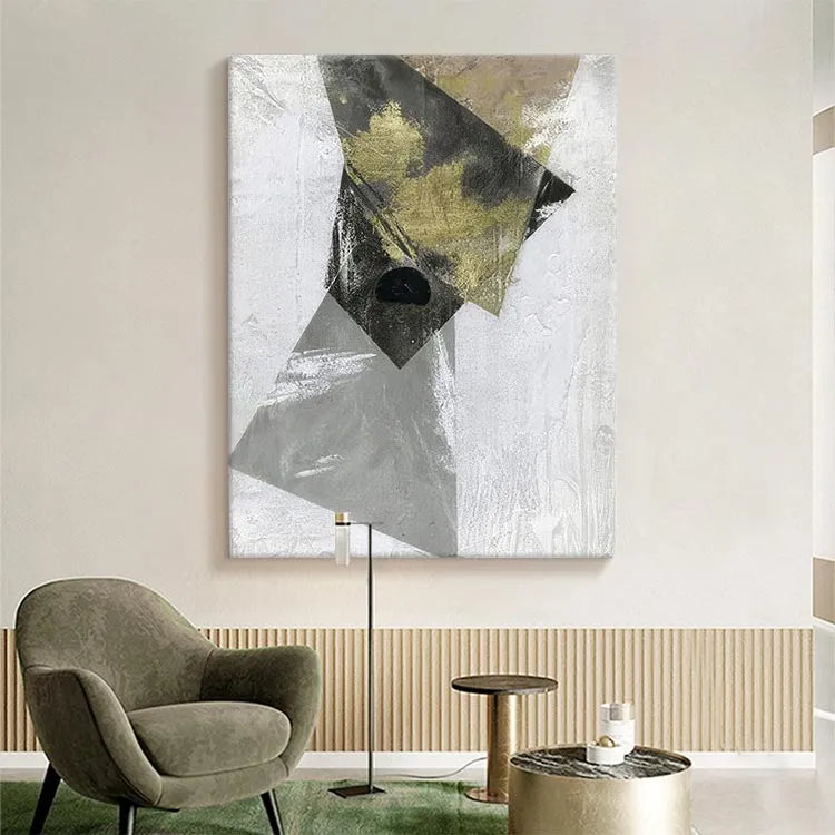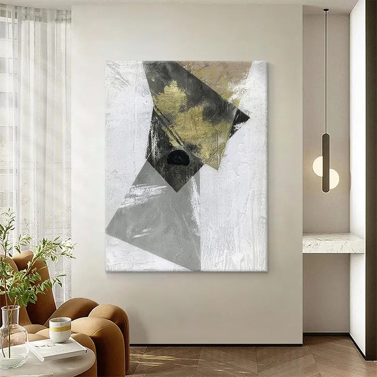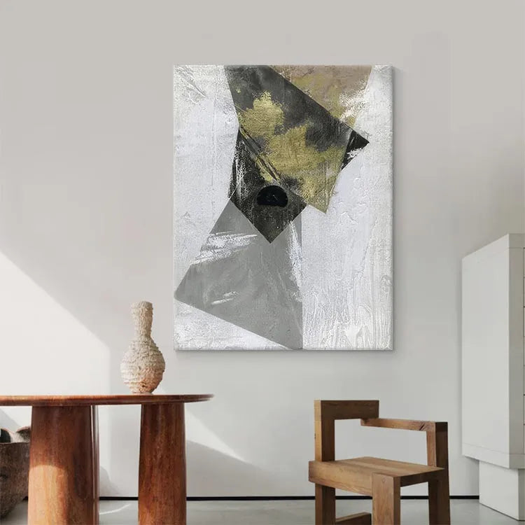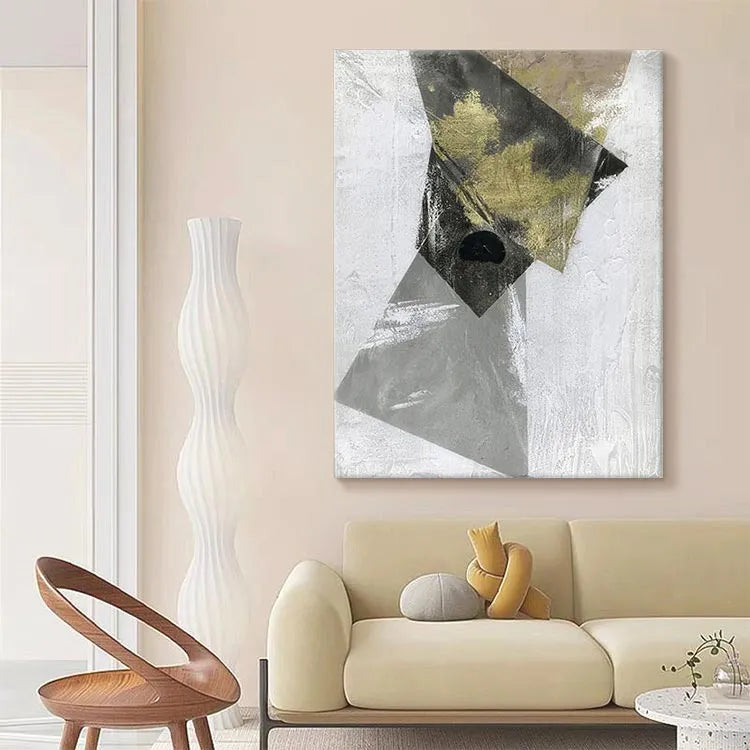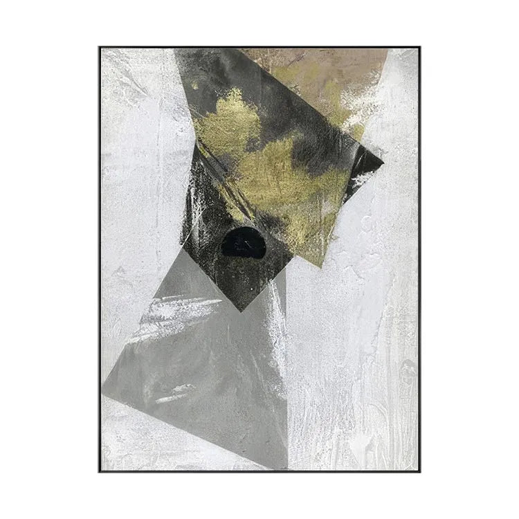 This oil painting features an abstract composition characterized by geometric shapes and a limited color palette. The central black and gold triangular form creates a focal point, with its dark, almost void-like center contrasting sharply against the surrounding golden patches. The textured white and gray background adds a sense of depth and layering, reminiscent of modernist movements like Cubism. The rough, almost gritty texture of the paint suggests a deliberate, tactile quality, enhancing the visual impact. The interplay between light and dark areas, combined with the geometric forms, evokes a sense of contemplation and introspection, aligning with the abstract expressionism movement. The use of color is restrained yet effective, emphasizing the central form's importance within the composition.