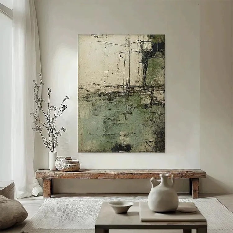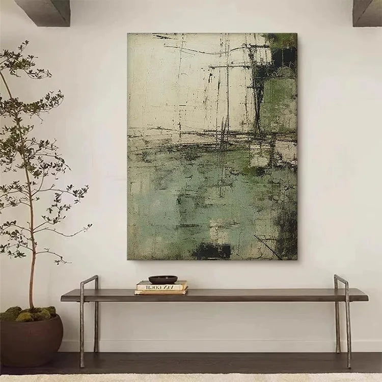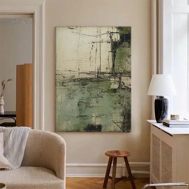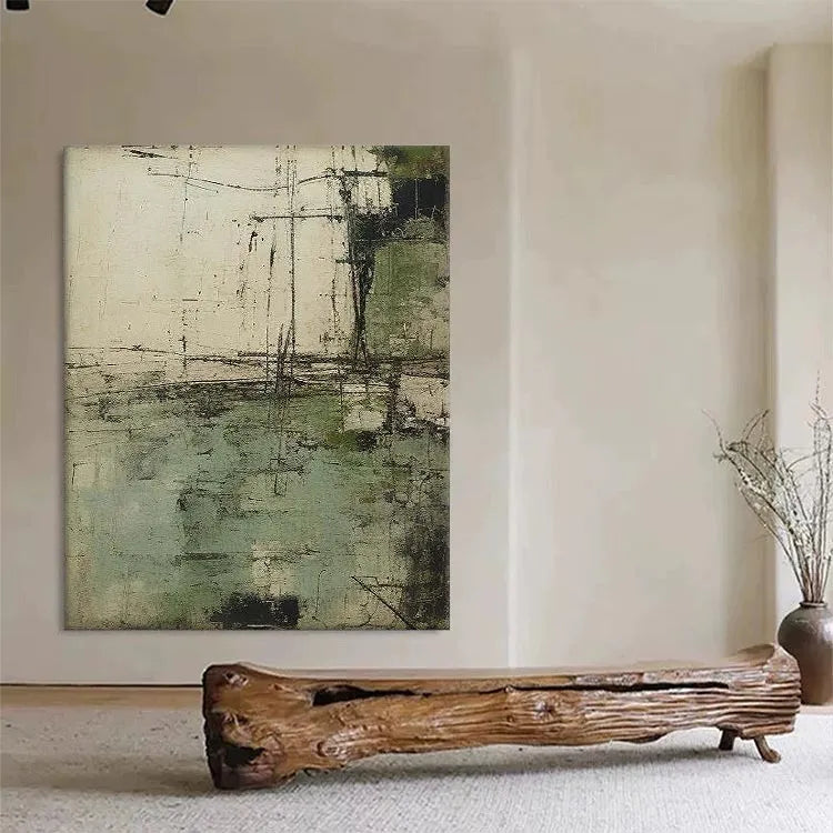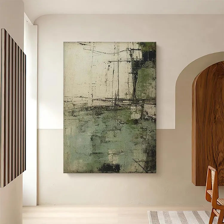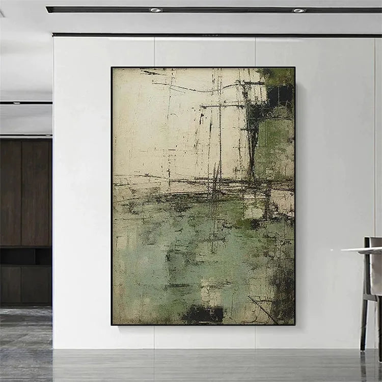 This abstract painting employs a textured, layered composition with a restrained color palette of muted greens, grays, and whites. The rough, almost concrete-like texture suggests a sense of decay or age, while the linear, scratch-like marks add a dynamic, almost mechanical quality. The horizontal and vertical lines intersect in a manner reminiscent of geometric abstraction, yet the overall effect is organic and unpredictable. The use of color is subtle, with the green patches providing a gentle contrast to the otherwise monochromatic scheme. The light appears diffused, creating a sense of depth and dimension. This work aligns with the Abstract Expressionist movement, characterized by its spontaneous creation and emphasis on texture and process over form.
