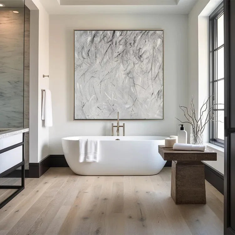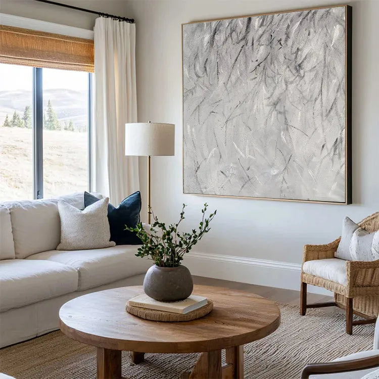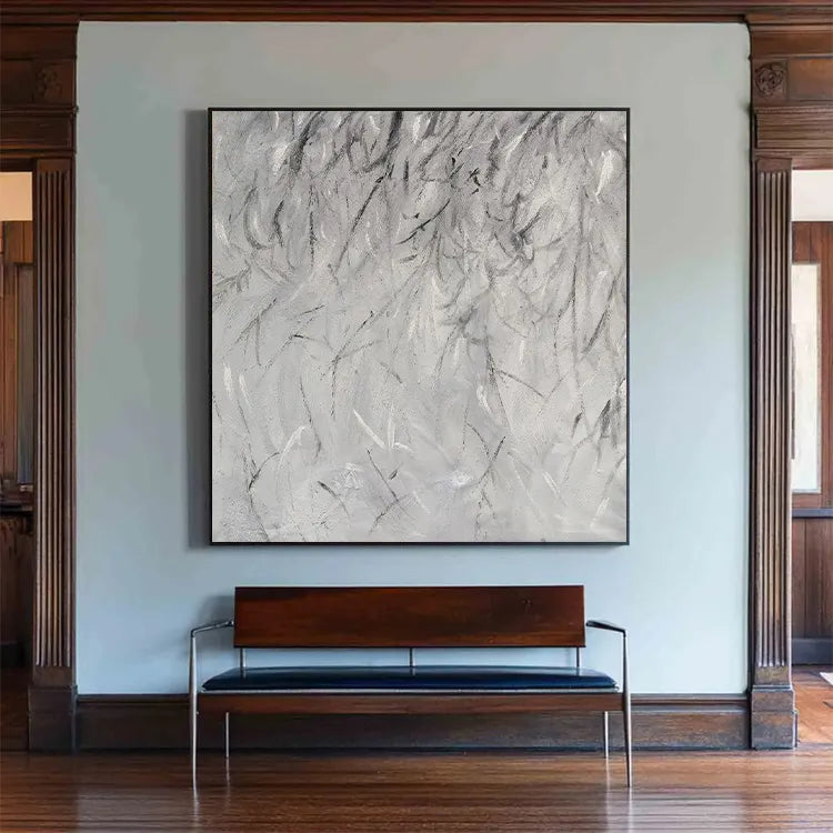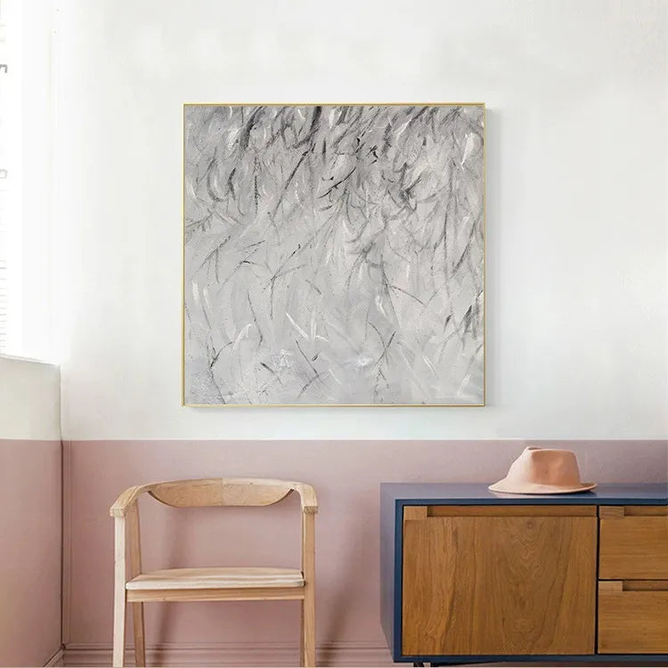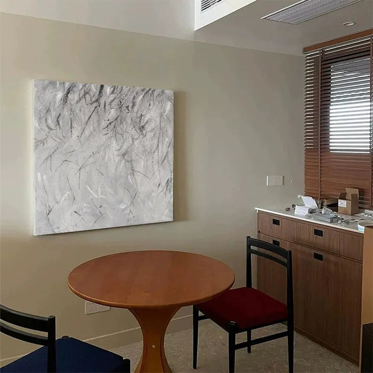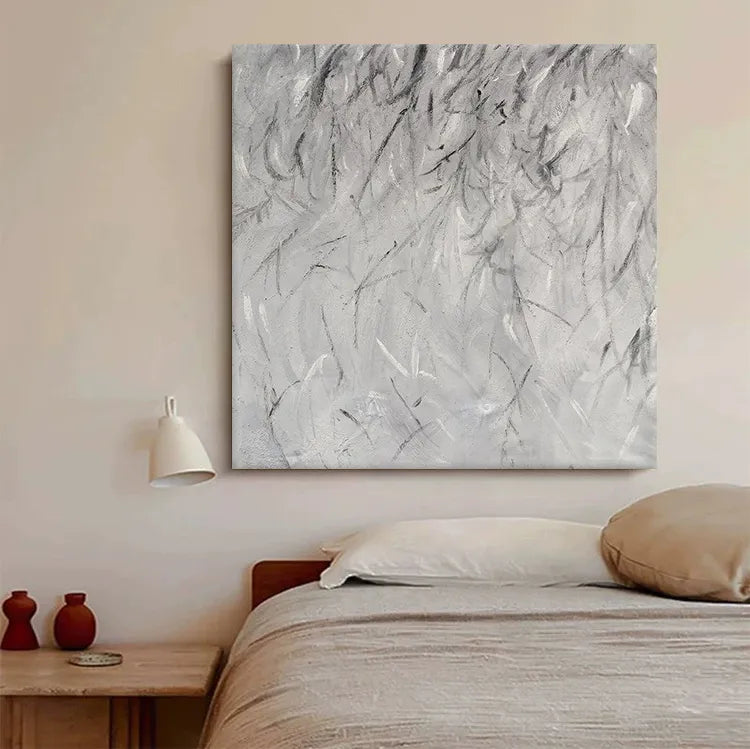 This oil painting presents a textured, abstract composition characterized by delicate, swirling brushstrokes in varying shades of gray and white. The subtle interplay of light and dark tones creates a sense of depth and movement, reminiscent of the Impressionist style. The artist's use of thin, almost translucent layers of paint allows the underlying surface to subtly peek through, adding a layer of complexity. The gentle, yet dynamic brushstrokes evoke a sense of fluidity and motion, suggesting an unseen force or breeze. The restrained color palette and emphasis on texture align with the principles of modern abstract expressionism. The overall effect is one of delicate motion and subtle emotional resonance.