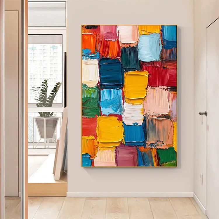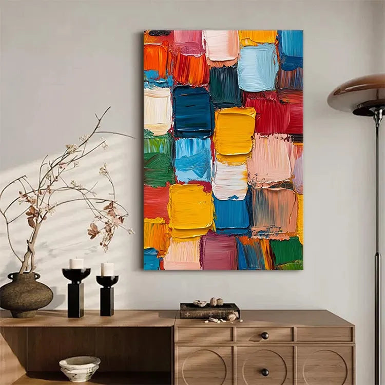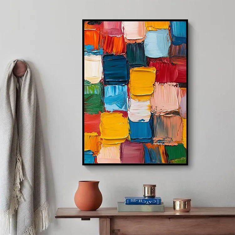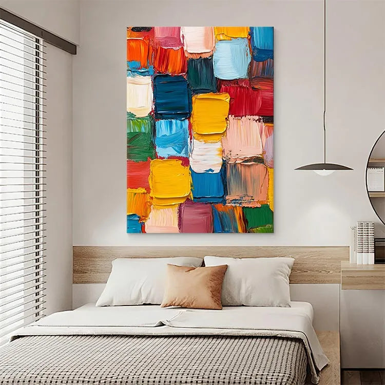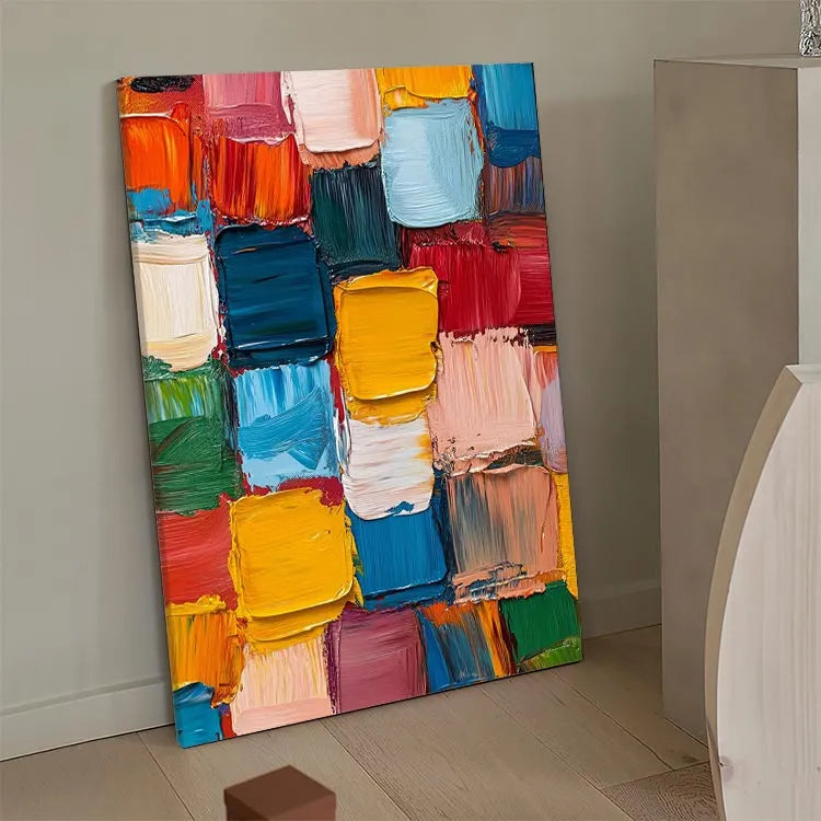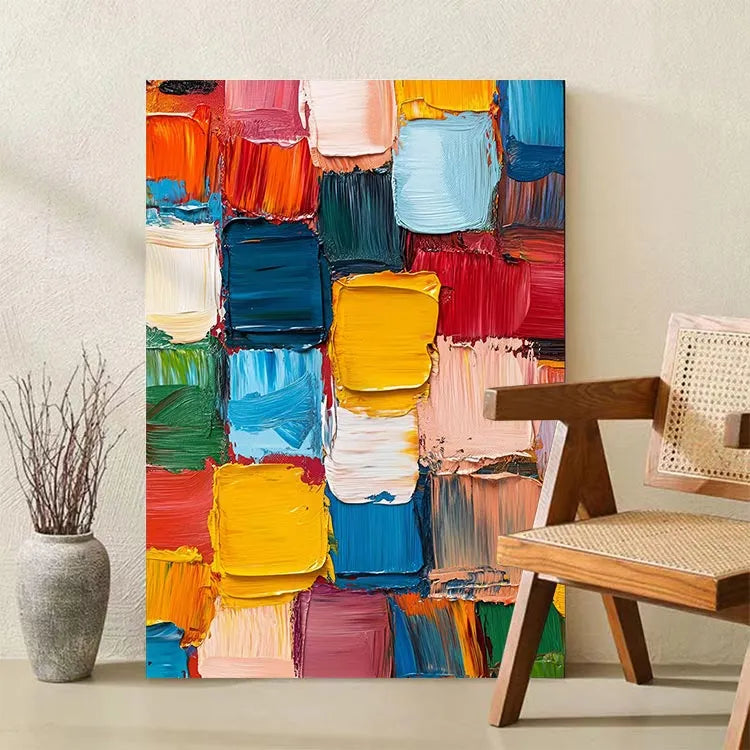 This vibrant abstract painting features a dense, grid-like arrangement of thick, textured brushstrokes in a rich palette of colors, including vivid yellows, deep blues, bright reds, and soft pinks. The use of bold, saturated hues creates a dynamic visual tension, while the thick, textured application of paint suggests a tactile quality. The composition's repetitive pattern evokes a sense of rhythm and movement, characteristic of the Abstract Expressionist movement. The artist's deliberate choice of color contrasts and the rough, almost chaotic brushstrokes add a sense of spontaneity and emotional intensity. The painting's texture and color interplay create a compelling visual experience, inviting viewers to explore its energetic and expressive qualities.