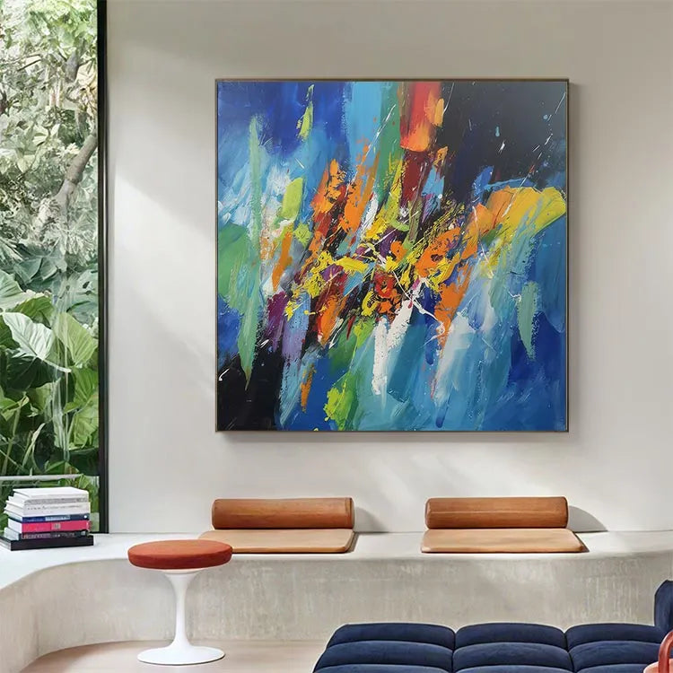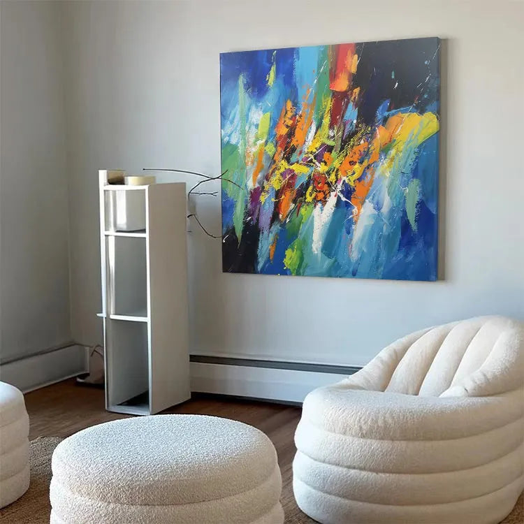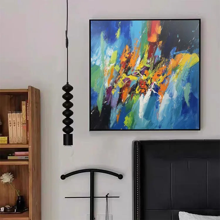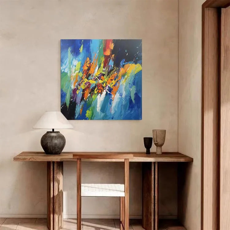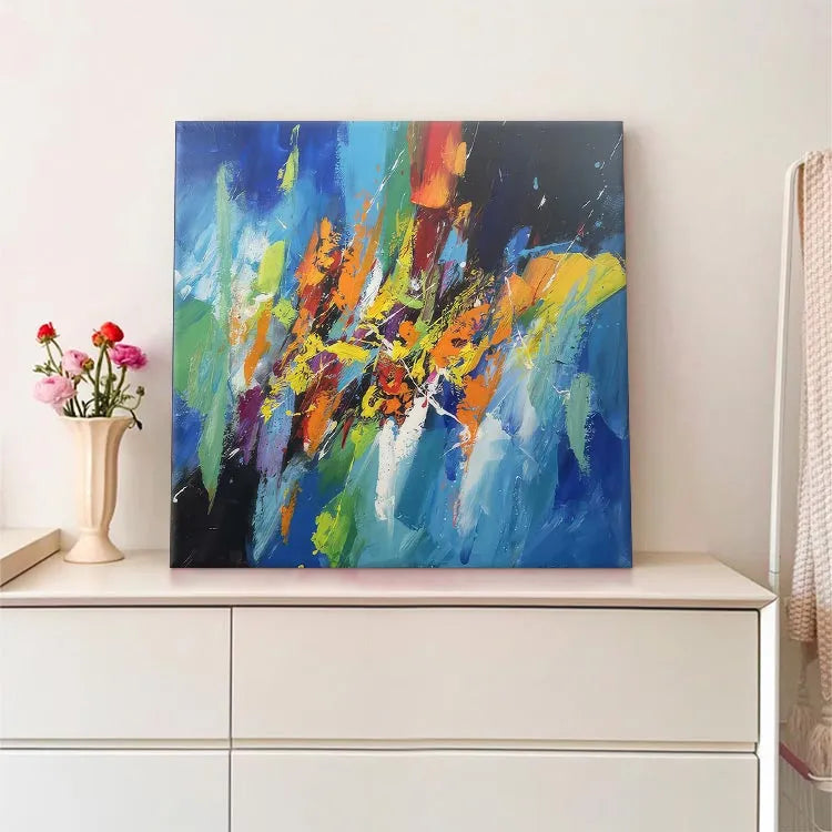 This vibrant abstract painting employs a dynamic, chaotic composition characterized by bold, sweeping brushstrokes and a rich, energetic palette. The use of bright, contrasting colors—especially the vivid oranges, blues, and greens—creates a sense of movement and tension. The texture is thick and expressive, with visible brushstrokes that add a tactile quality to the piece. The interplay of light and dark areas suggests depth and complexity. The painting's style aligns with the Abstract Expressionism movement, reminiscent of artists like Jackson Pollock. The chaotic, yet harmonious, arrangement of colors and forms evokes a sense of spontaneity and emotional intensity.
