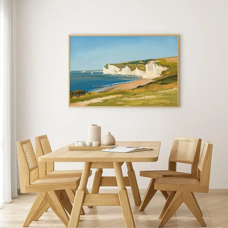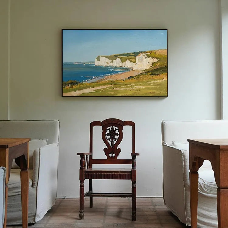 This landscape painting, likely influenced by the Impressionist movement, showcases a serene coastal scene. The composition utilizes a balanced, horizontal structure with the cliffs and beach in the mid-ground, and the expansive sky in the background. The artist employs a bright, sunlit palette, with vivid blues and greens contrasting against the white cliffs. The use of light and shadow creates a sense of depth and realism, while the brushstrokes are visible yet controlled, adding texture to the grassy foreground and the rippling sea. The gentle, undulating lines of the cliffs and the subtle gradations in color suggest movement and the passage of time, evoking a tranquil, timeless quality.