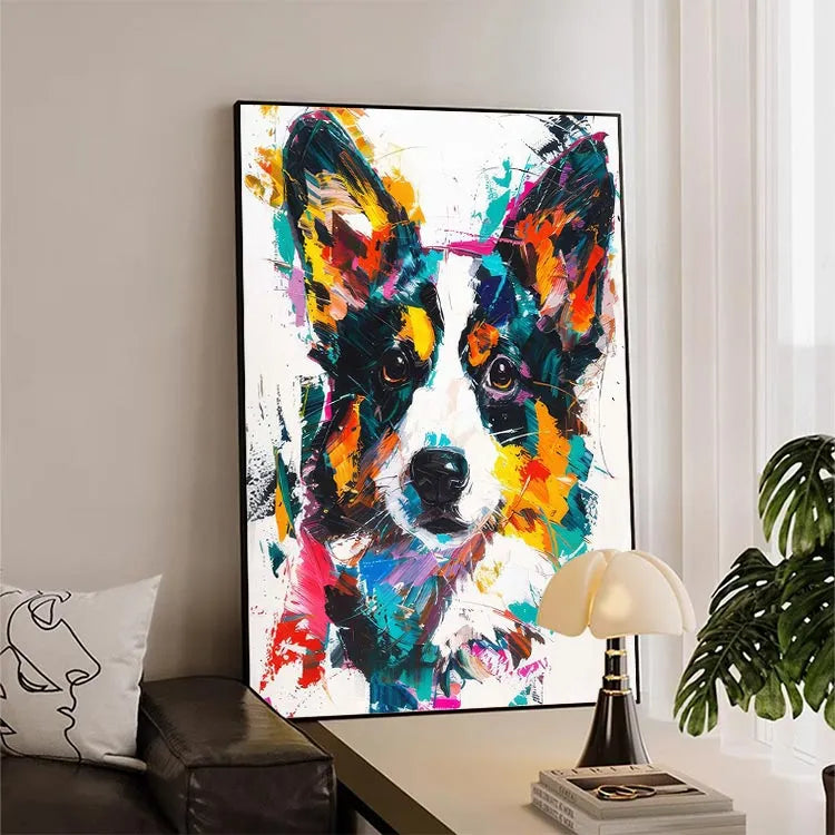 This vibrant abstract painting of a dog employs a dynamic, expressive style reminiscent of Expressionism. The artist uses bold, chaotic brushstrokes and vivid colors—primarily blues, oranges, and purples—to create a sense of energetic movement and emotional intensity. The dog's face, with its large, attentive eyes, serves as the focal point, drawing the viewer's gaze. The juxtaposition of dark and light areas adds depth and contrast, enhancing the subject's lifelike quality. The texture is rough and impasto, with visible brushstrokes adding a tactile quality. The use of color suggests a playful yet profound connection, symbolizing the dog's vitality and the artist's emotional response. This work blends realism with abstract expression, making it a compelling example of contemporary abstract portraiture.