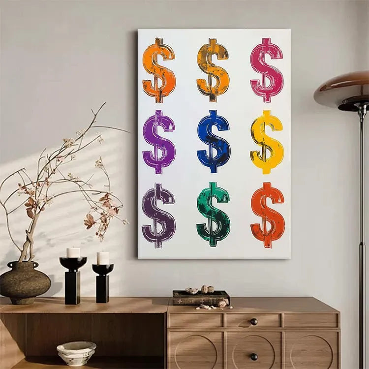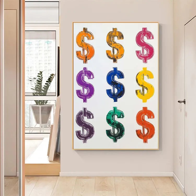 This vibrant painting features nine large, colorful dollar signs arranged in a vertical column against a white background. The use of bright, primary and secondary colors—orange, purple, blue, pink, yellow, green, and red—creates a visually striking and dynamic composition. The textured, slightly worn appearance of the dollar signs suggests a mixed-media approach, possibly combining paint and collage techniques. The bold, flat color application and simplified forms align with the Pop Art movement, characterized by its playful use of commercial paintingry and vivid colors. The repetition and symmetry of the dollar signs evoke a sense of rhythm and unity, while the varied colors and textures introduce a sense of individuality and diversity.