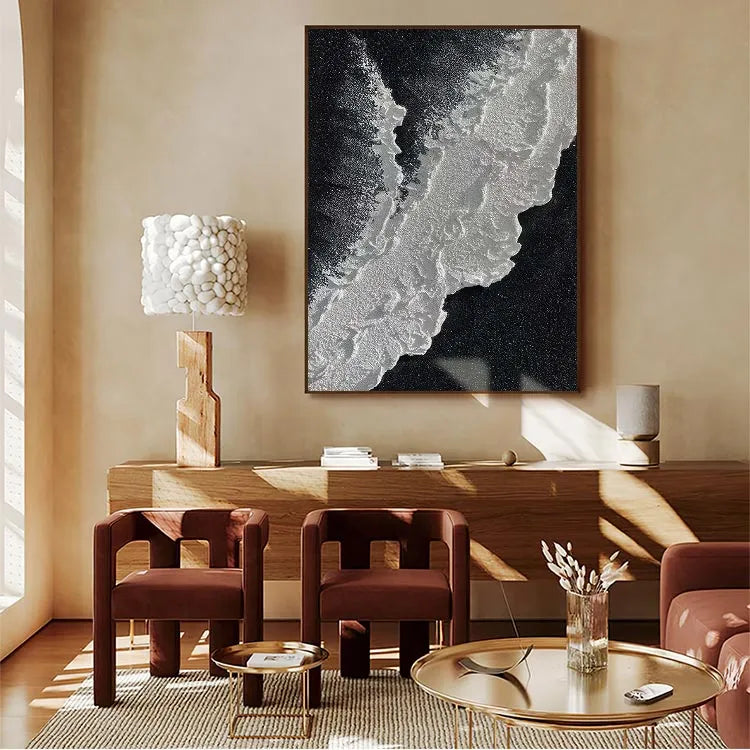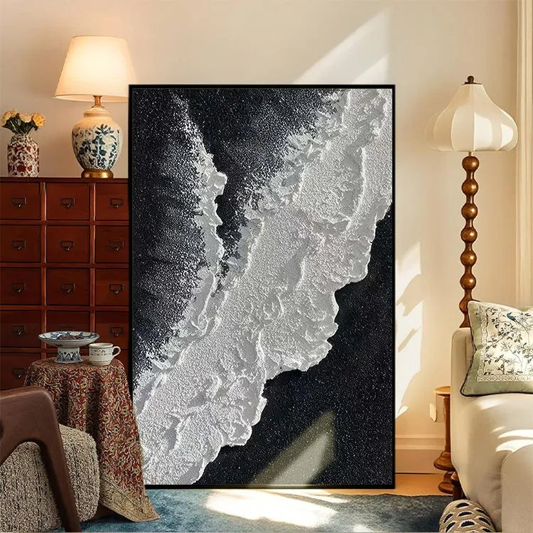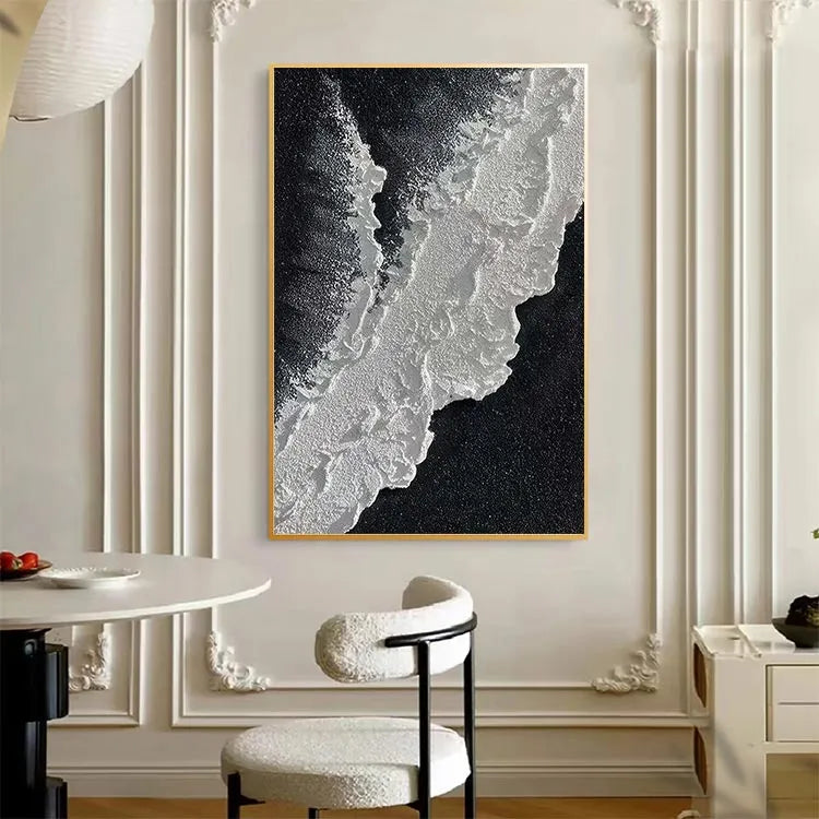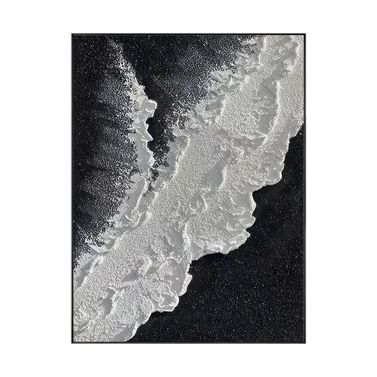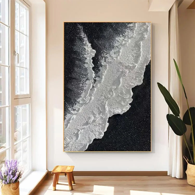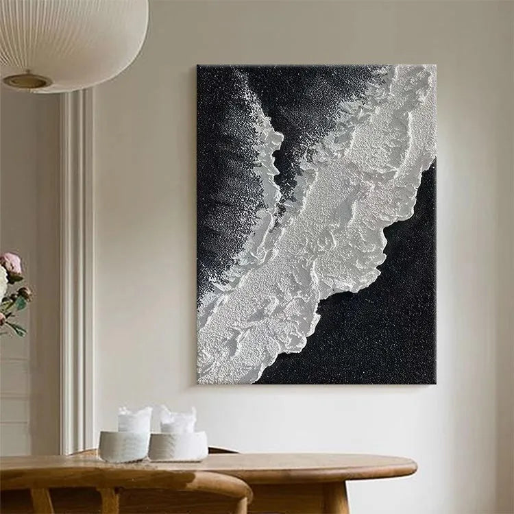 This oil painting presents a dynamic, abstract composition characterized by a stark contrast between dark and light areas. The texture is rich and textured, with visible brushstrokes that create a sense of movement and fluidity, reminiscent of the Impressionist movement. The use of color is minimalistic, with the dark, almost black background juxtaposed against the white, frothy textures, suggesting the presence of water. The light source is subtle, yet effective, highlighting the textured waves and creating a sense of depth. The composition evokes a natural phenomenon, possibly a coastal scene, with a focus on the interplay between land and sea. The painting's style is both contemporary and timeless, emphasizing texture and contrast.